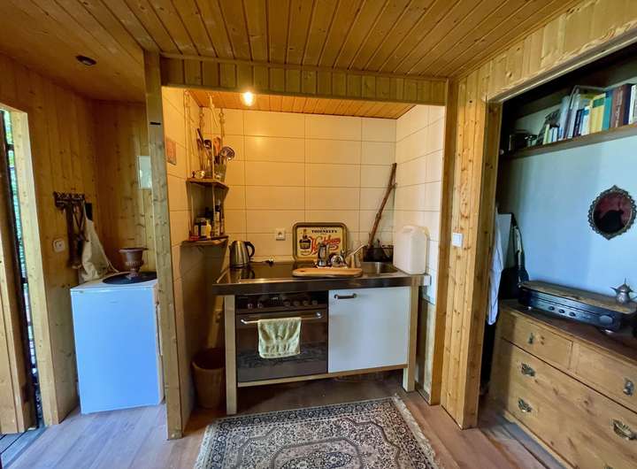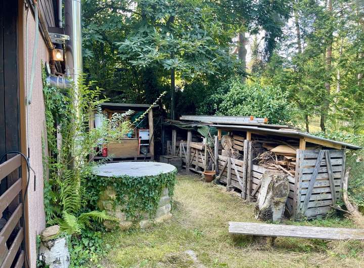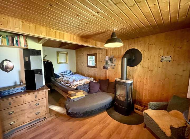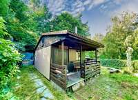 Im oberen Teil dieses Grundstücks befindet sich ein liebevoll ausgestattetes Gartenhaus mit Wohn-, Koch- und Schlafbereich und einem Bad mit Badewanne, Waschbecken und WC (Wasserversorgung über auffüllbare Wassertanks).