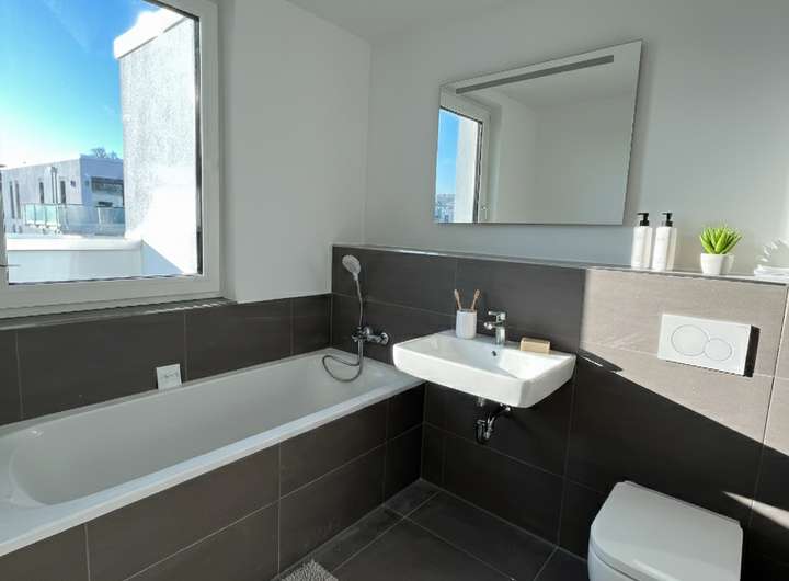 2. Obergeschoss: Die zweite Etage präsentiert das dritte Zimmer, das vielseitig genutzt werden kann – sei es als zusätzliches Schlafzimmer, Home-Office oder als kreativer Raum nach eigenen Vorstellungen. Ein weiteres Badezimmer mit einer einladenden Badewanne und bodentiefen Dusche verleiht der Etage eine besondere Note. Durch die nur leicht geneigten Flachdächer steht Ihnen selbst im obersten Geschoss die volle Raumhöhe zur Verfügung. Das Highlight dieses Stockwerks ist die großflächige Dachterrasse, die schöne Aussichten auf die Umgebung ermöglicht und ein ideales Plätzchen für Entspannung unter freiem Himmel ist. Da die Staffelgeschosse jeweils versetzt angeordnet sind, können Sie auf der großen Dachterrasse völlig ungestört Ihre Privatsphäre, bei einer Tasse Kaffee in der Morgensonne oder einem Glas Rotwein zum Sonnenuntergang, genießen.