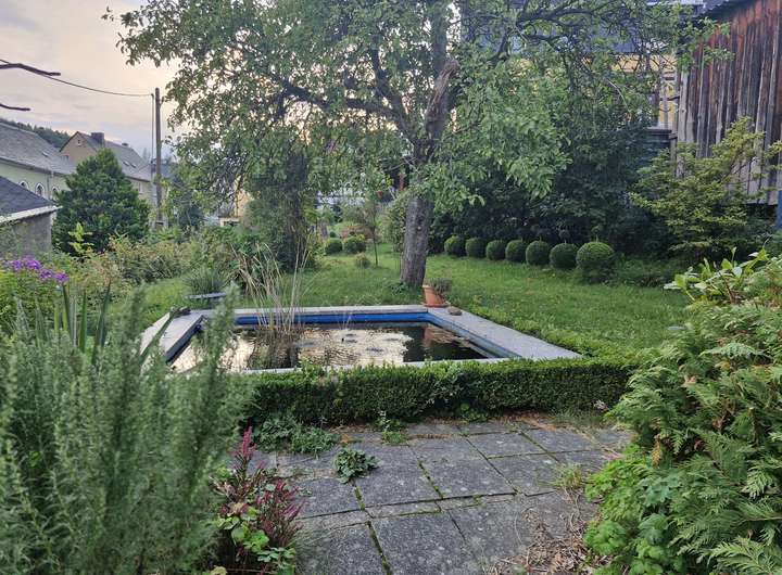 Das ca. 690 m² große Grundstück ist mit einer Rasenfläche, sowie verschiedenen Bäumen, Sträuchern und einem sehr schönen Teich, liebevoll angelegt. Natürlich findet Ihr Kind ausreichend Platz zum Spielen und Toben und auch für Sandkasten, Rutsche und Schaukel findet sich ein Plätzchen.