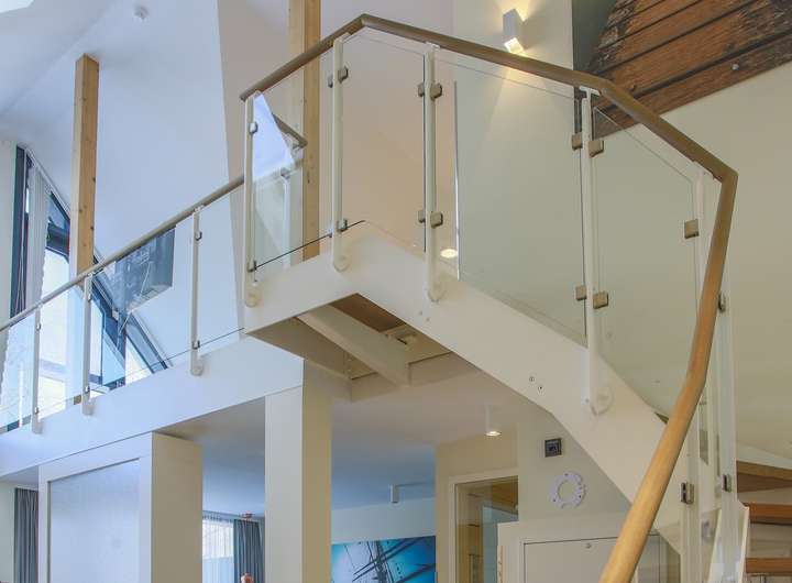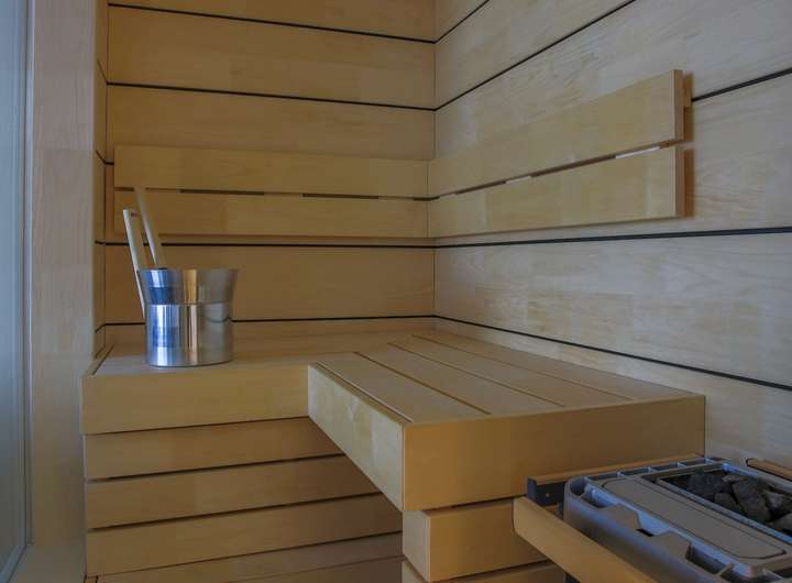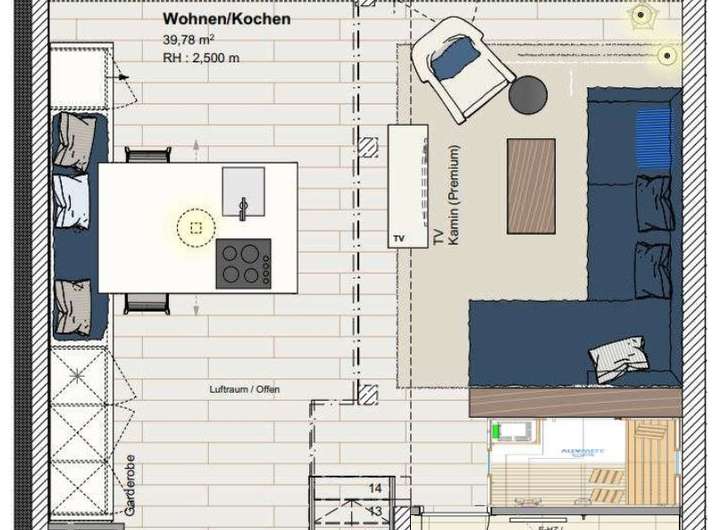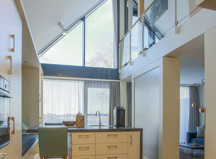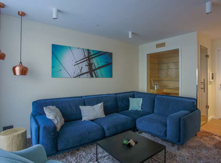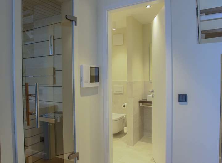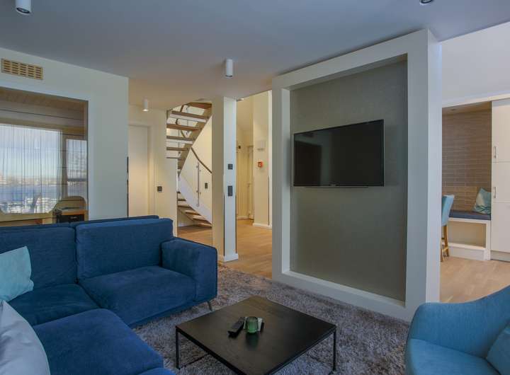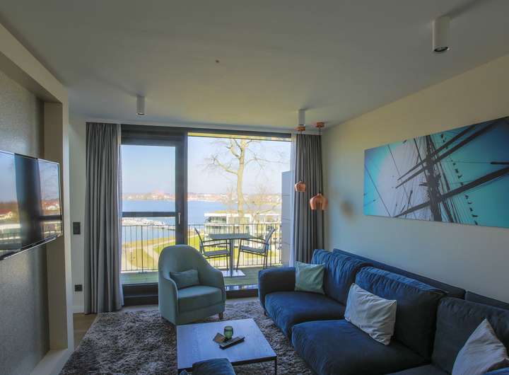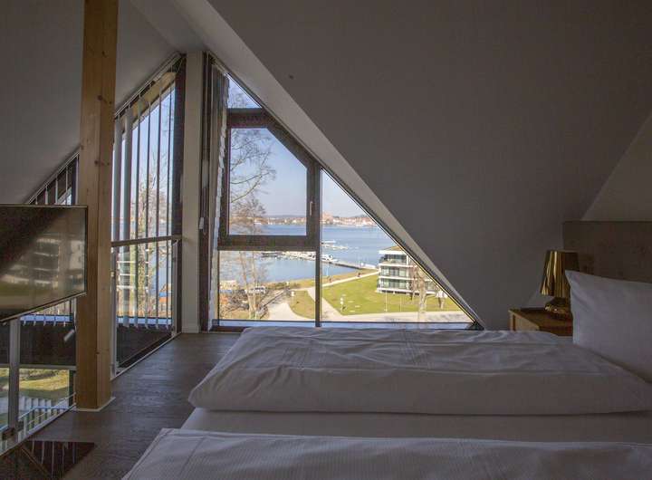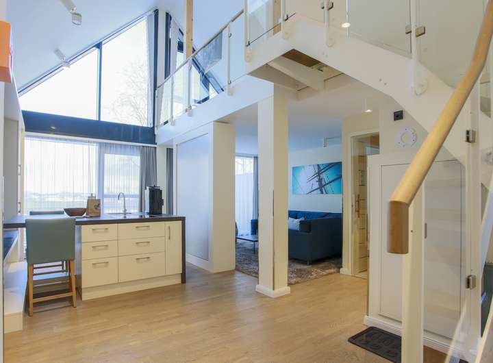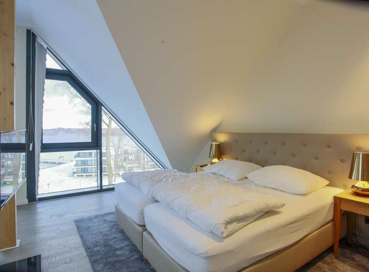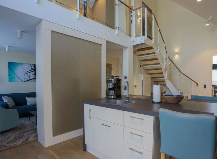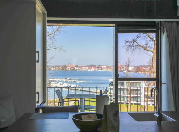 Im unteren Geschoss erwartet Sie eine lichtdurchflutete Wohnküche mit integriertem Essbereich. Durch die bodentiefen Fenster gelangen Sie direkt auf den großen Balkon, der sich ideal für erholsame Stunden im Freien anbietet. Abgerundet wird das untere Geschoss durch eine Sauna mit der schönen Aussicht zum Yachthafen durch die große Glasscheibe als Trennwand.