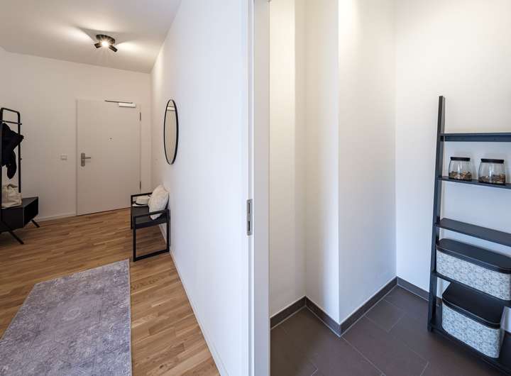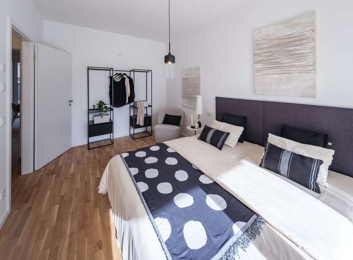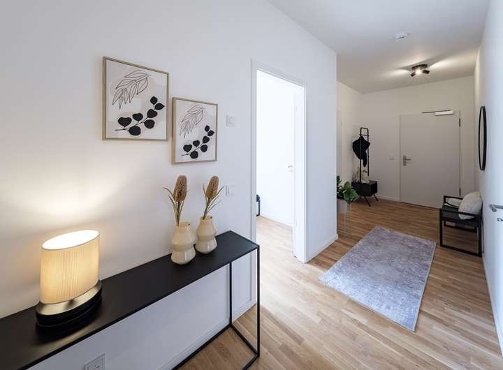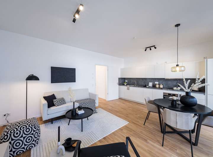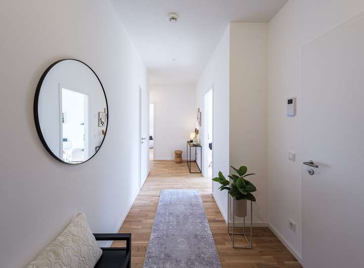 Alle Wohnungen sind hochwertig ausgestattet. Die Wohnungen verfügen über einen offenen Wohn-/Ess-/Küchenbereich, Parkettböden in allen Wohnräumen, Fußbodenheizung mit Einzelraumsteuerung, elektrische Rollos sowie moderne Bäder mit bodengleicher Dusche.