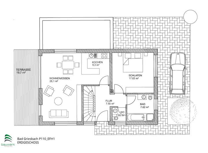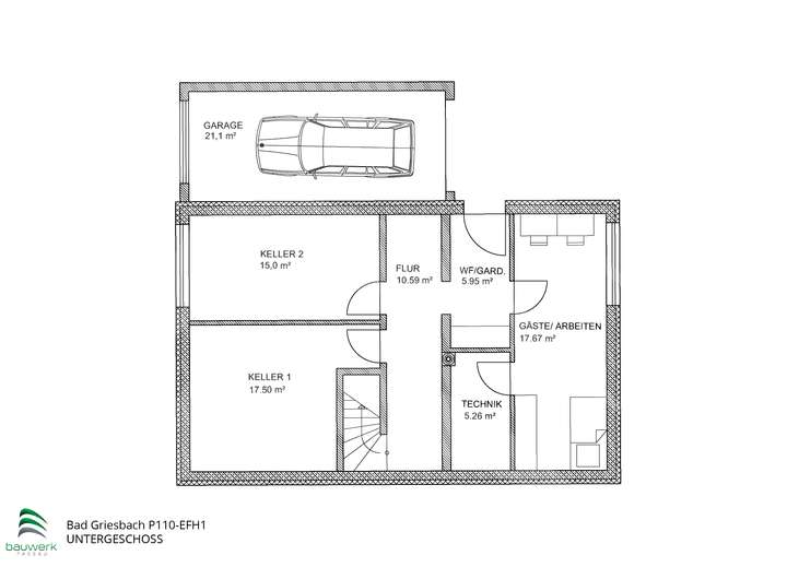 Aufgrund der leichten Hanglage ist ein Teil des Untergeschosses als Wohnraum nutzbar. Die Kellerräume und der Technikraum wurden intelligent im Hangbereich angeordnet. So ist eine optimale Nutzung der Fläche möglich.