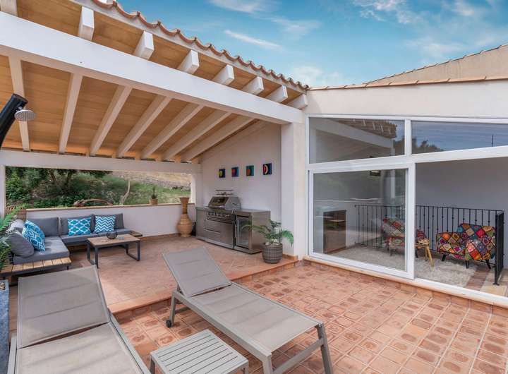 * großzügige Dachterrasse mit Panoramablick über Cala Ratjada bis zum Meer und zur Burg von Capdepera und hochwertige Außenküche