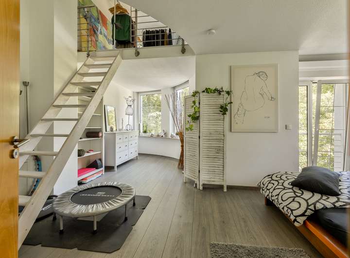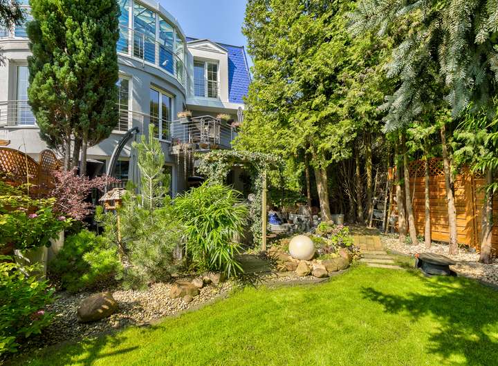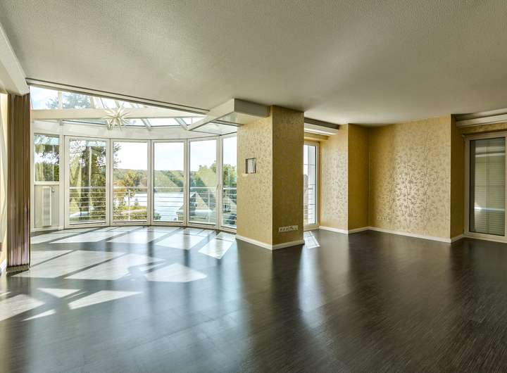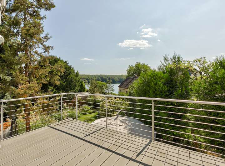 Jede Villenhälfte ist mit einer Terrasse zum Garten, einem Balkon und einem Wintergarten mit vollflächig zu öffnender Fensterfront im Studio ausgestattet. Diese bieten atemberaubende Ausblicke auf den Kalksee und die umliegende Natur. Für gemütliche Stunden sorgen jeweils ein Kamin und eine Sauna, die in beiden Villenhälften vorhanden sind.