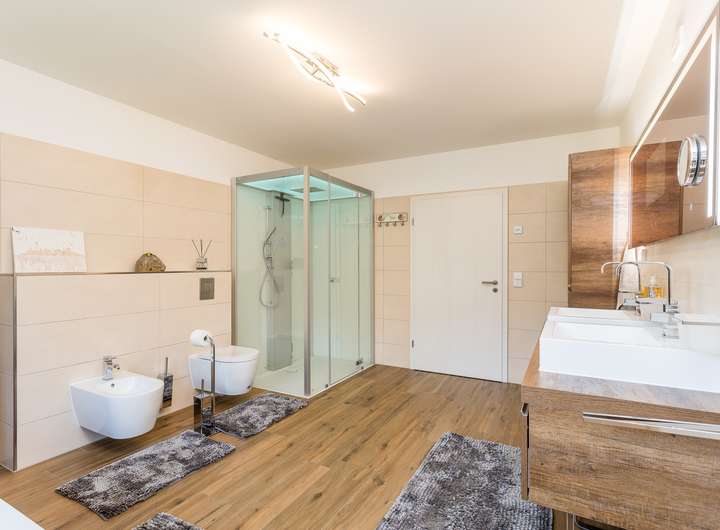 • Tagesbelichtetes Vollbadezimmer mit 2-Sitziger Dampfsauna inkl. Soundanlage und Lichttherapie von der Marke Hoech
