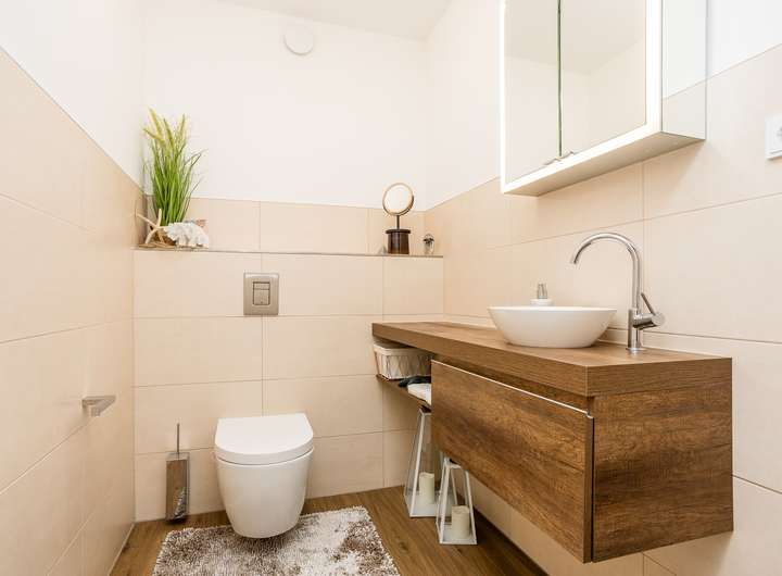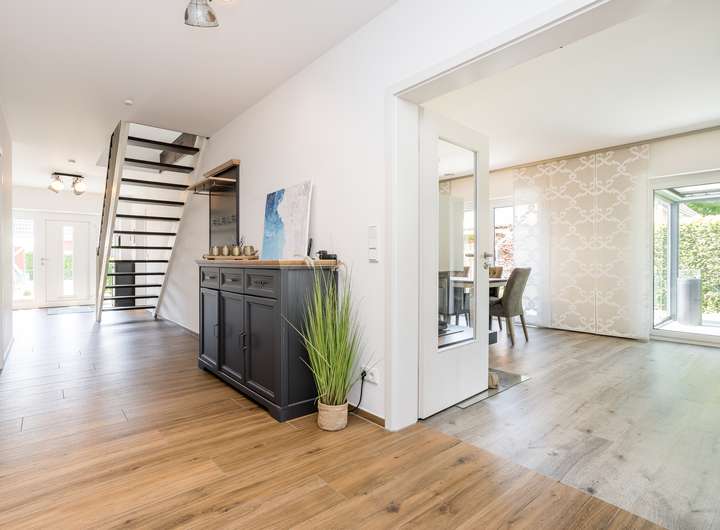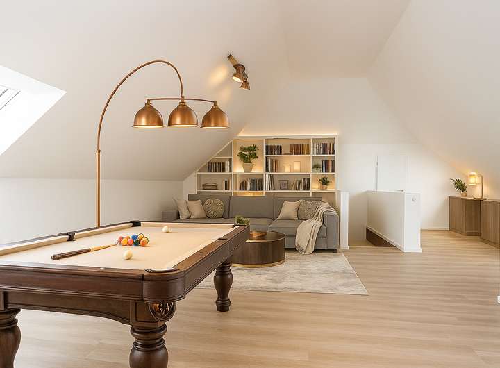 • Laminatböden, Fliesen in Holzoptik, Teppich im ausgebauten Dachgeschoss