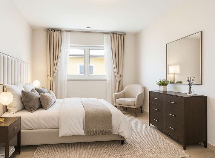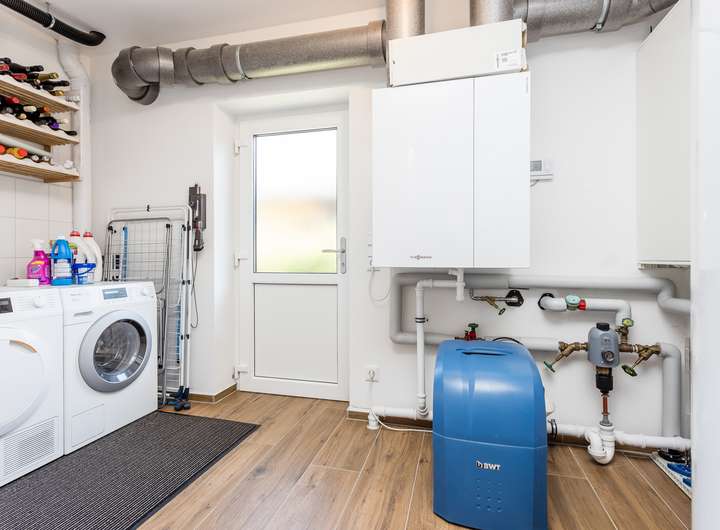 Die moderne Luftwasserwärmepumpe und die Photovoltaikanlage machen das Haus energieautark und umweltfreundlich. Eine Wasserenthärtungsanlage sorgt für weiches Wasser, während die Lüftungsanlage mit integriertem Pollenfilter stets für frische und saubere Luft sorgt. Die Deckenheizung sowie -kühlung ermöglichen eine individuelle Temperaturregelung in den Räumen. Mit einer Deckenhöhe von ca. 2,60 Metern und dreifachverglasten Kunststoff-Isolierglasfenstern ist das Haus optimal isoliert. Elektrische Außenjalousien bieten zusätzlichen Schutz und Privatsphäre.