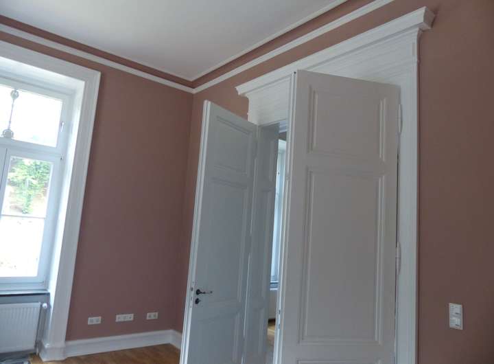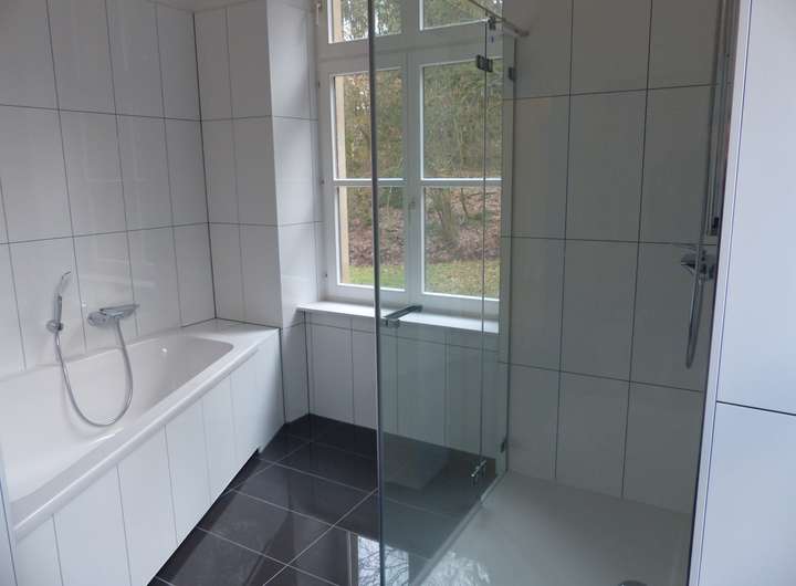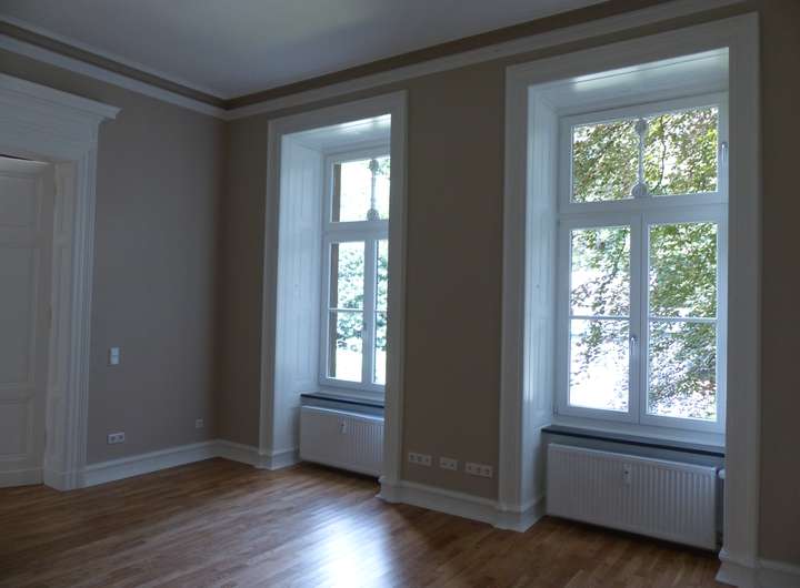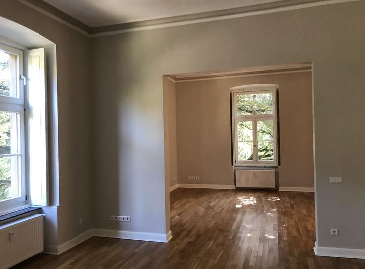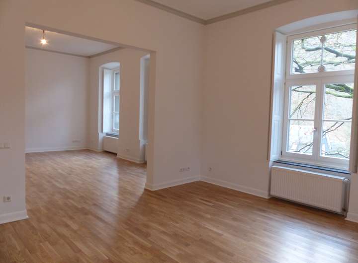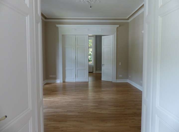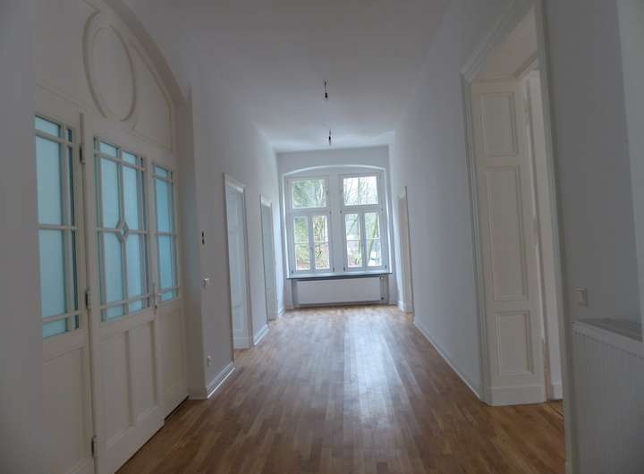 156 m2 große Wohnung im Erdgeschoss, mit eigenem getrennten Eingang und eigenem Ausgang zu einem abgetrennten und großen eingezäunten Garten Bereich. Nur alleine diese Wohnung ist für monatlich 1.940 € Kaltmiete vermietet. Die Wohnung hat aufwendig restaurierte Stuckdecken. Deckenhöhe fast 4 Meter. Die 5-Zimmer-Wohnung ist durch den eigenen Eingang und eigenen Terrassenbereich mit Garten im Prinzip wie ein eigenes Haus im Haus. Wie alle Wohnungen mit High End Ausstattung. Hochwertiger Stab-Parkett, jedes Massiv-Holz-Stäbchen aufwendig einzeln verlegt. im Flur der historische wieder rekonstruierte Schiefer/Granit-Boden. Hauptbad mit zwei übergroßen Fenstern. XXL Dusche, Echtglasabtrennung, große Badewanne für zwei, extra hohe Innentüren, komplette LAN Verkabelung in allen Räumen, aufwendig gespachtelte und gestrichene Wände, statt billiger Raufaser.