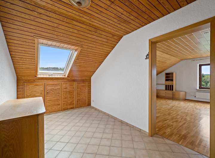 Im Dachgeschoss, welches separat genutzt werden kann, befindet sich eine große Diele, ein Schlafzimmer mit Einbauschrank, ein weiteres Zimmer, welches auch als Wohnzimmer genutzt werden könnte, ein Durchgangszimmer (potentiell Küche) und das Bad mit angrenzendem kleinem Abstellraum.