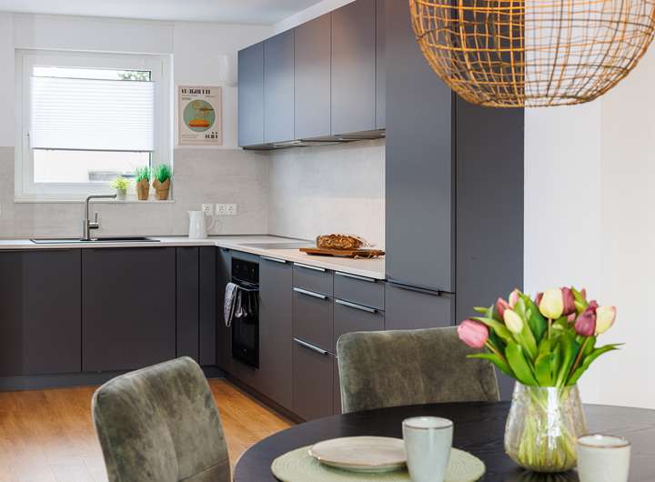 Wohnzimmer und Koch-/Essbereich sind offen und klar strukturiert. Großformatige Fenster lassen viel Licht in die Räume. Bei Bedarf kann die Küche abgetrennt und mit einer eigenen Dielentür versehen werden. Terrasse und Garten werden bei schönem Wetter zum zusätzlichen Lebensraum.
