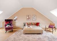 Ob zum Arbeiten, Entspannen oder als geräumiges Schlafzimmer: Das großzügige Studio mit ca. 27 m² lässt viele Gestaltungsmöglichkeiten zu. Auf Wunsch ist der Zutritt vom Dachgeschoss auf eine Dachterrasse möglich (Ausstattung als Sonderwunsch: Terrassenleuchte, Plattenbelag und Außensteckdose).
