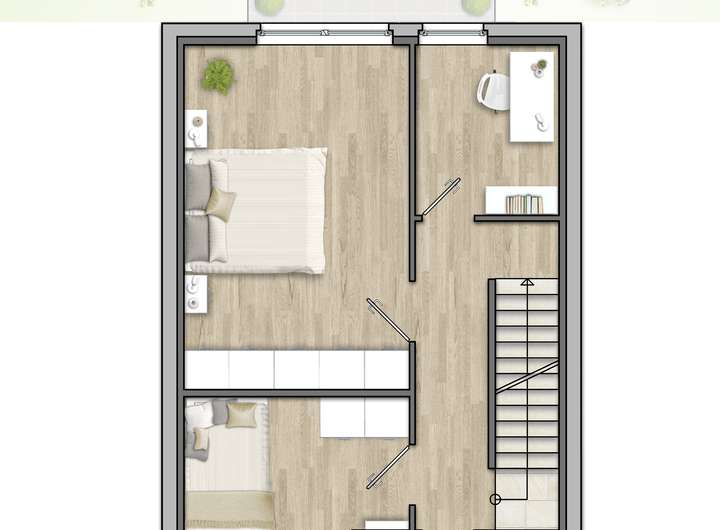 Auch hier sorgen große Fenster in den Räumen für eine helle und freundliche Atmosphäre. Zwei große Zimmer können beispielsweise als Kinder-, Hobby- oder Elternschlafzimmer genutzt werden. Auf Wunsch entsteht durch eine Trennwand ein weiterer Raum, der als Gäste- und Arbeitszimmer oder als begehbarer Kleiderschrank genutzt werden kann. Das Bad mit Fenster bietet ausreichend Platz für eine Dusche und eine Badewanne.