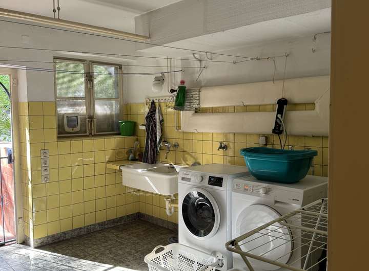 Im Kellergeschoss befinden sich neben den klassischen Kellerräumen wie Heizraum, Abstellkeller und Waschküche weitere zu Wohnzwecken ausgebaute Räume. Hierzu liegt keine baurechtliche Genehmigung vor. Ausreichende Belichtung und Rettungswege machen die Räume genehmigungsfähig. So kann eine ca. 69 qm große Wohnung mit Wohnraum, Küche, Schlafzimmer und Bad geschaffen werden.
