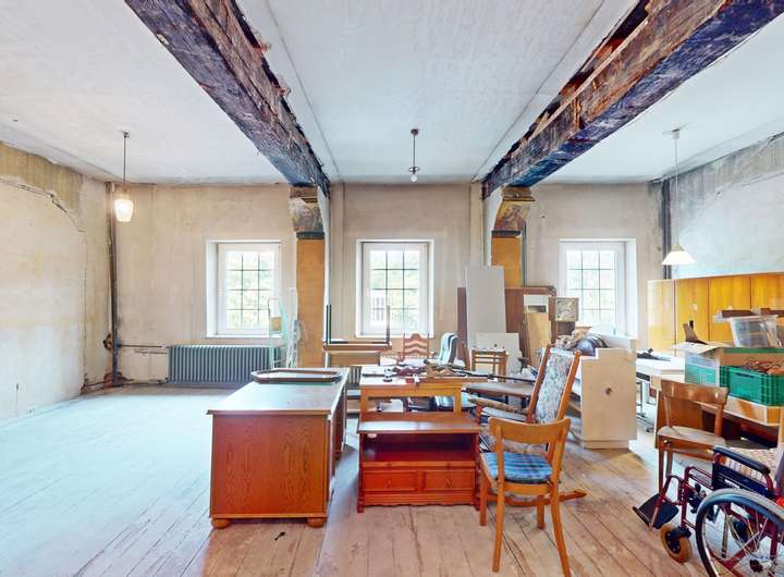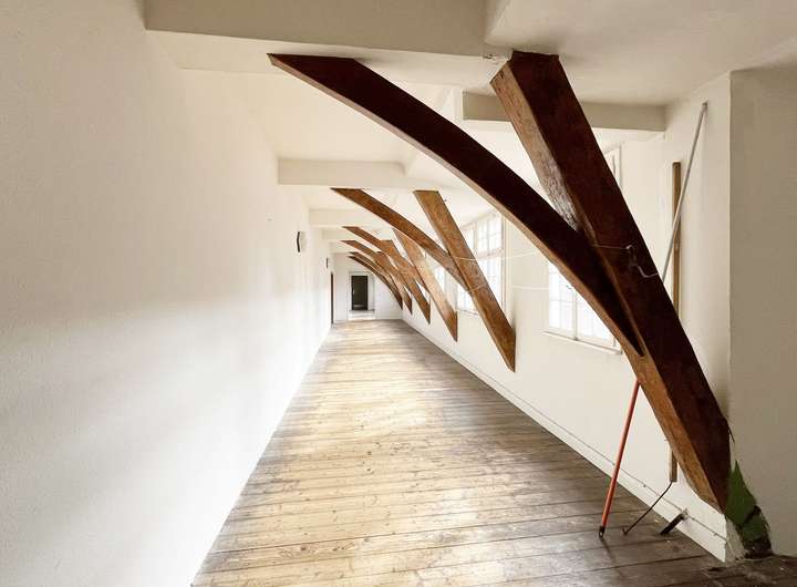 Das Dachgeschoss beeindruckt mit seinem offenen Ständerwerk, während sich im Gewölbekeller das gemauerte Tragwerk eindrucksvoll in Szene setzt.