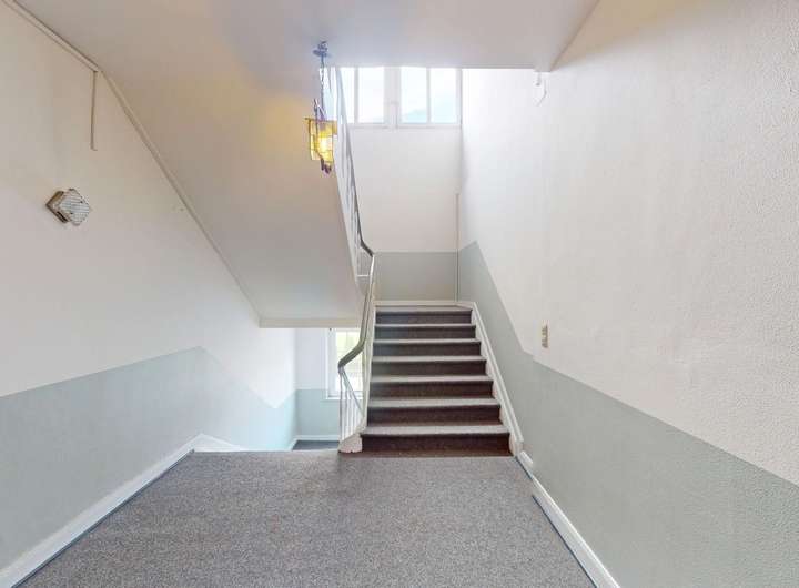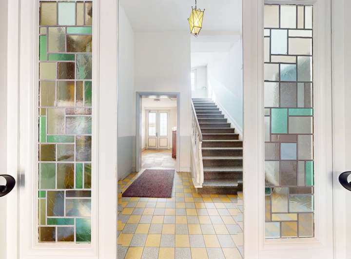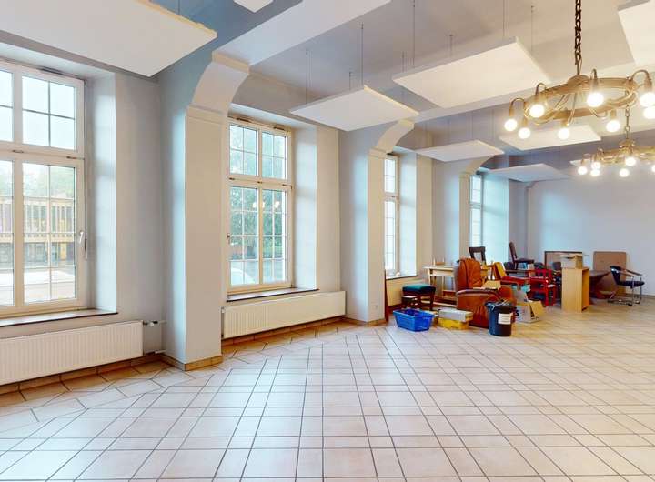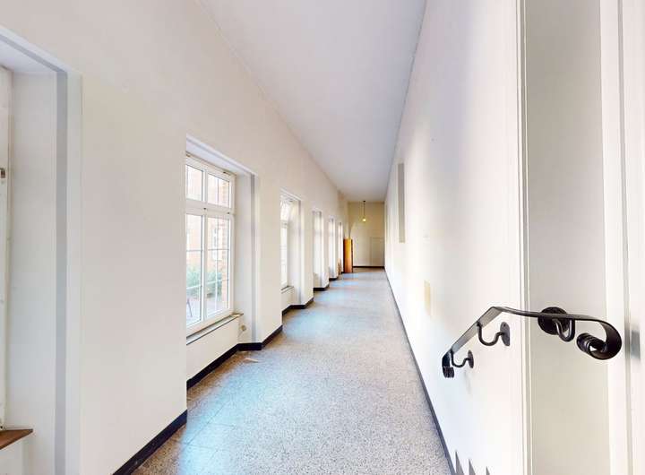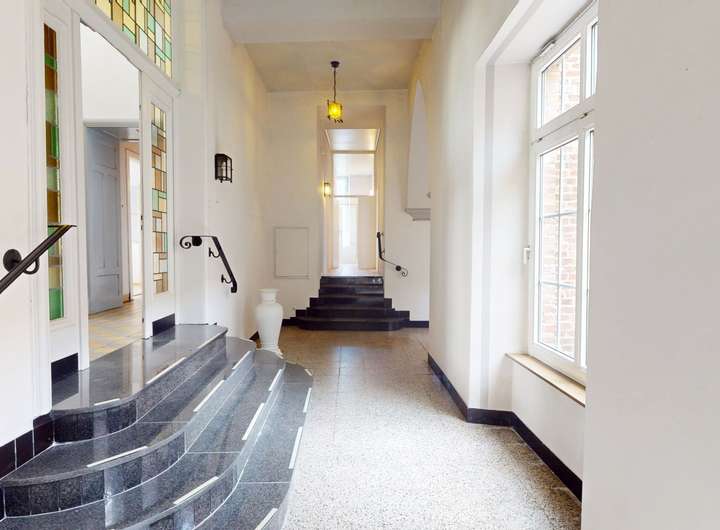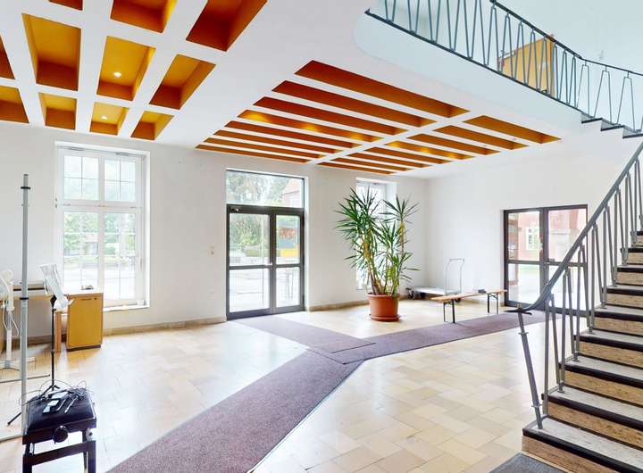 Zusätzlich zum Haupteingang durch die Pforte können Sie das großzügige Innere auch über zwei Doppelflügeltüren vom Schulgelände aus betreten. Von dieser Eingangslobby führt eine markante Treppenanlage in die oberen Etagen.