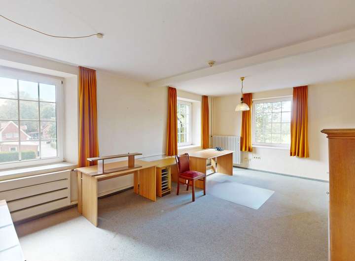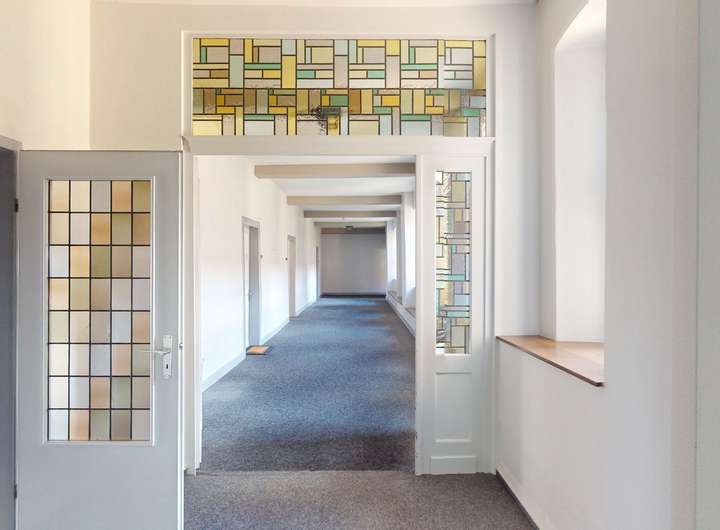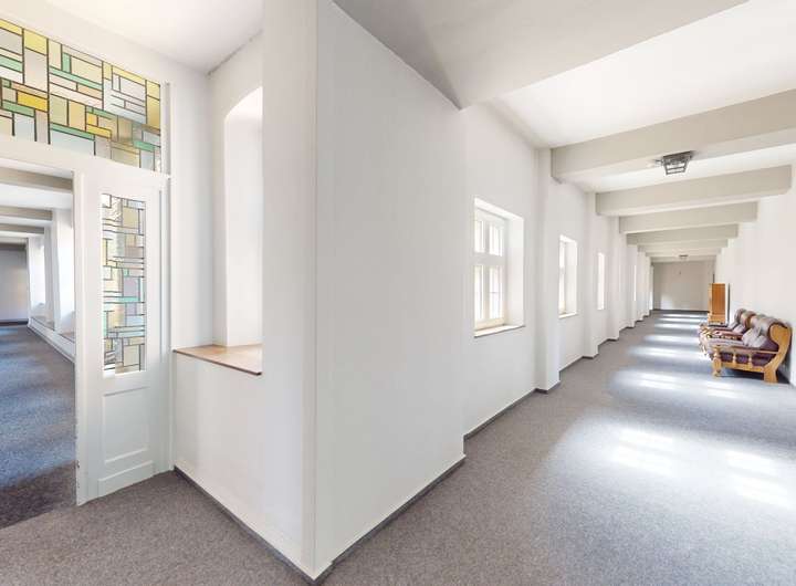 Die Räume sind schlicht und funktional gestaltet. Sprossenfenster als Einheitsvierecke, Rundbögen, kunstvolle Bleiglasfenster und Kassettentüren setzen besondere Akzente.