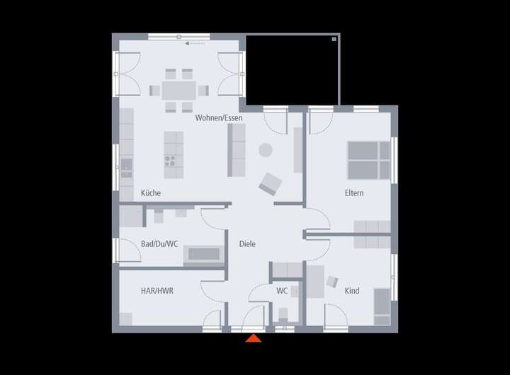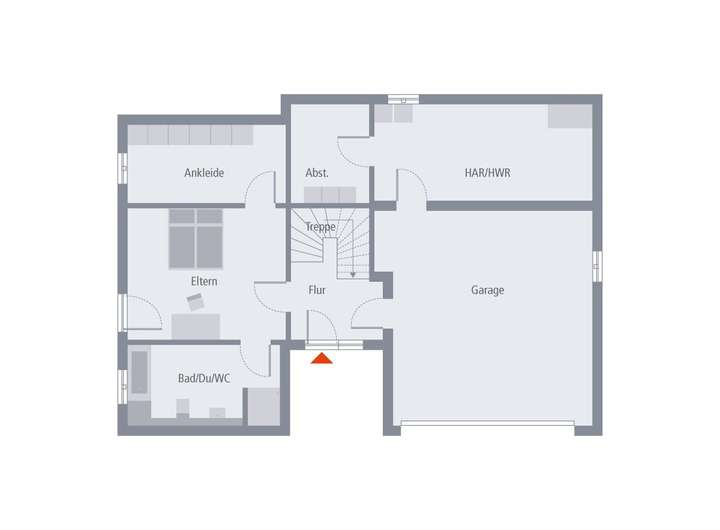 Mittelpunkt des Erdgeschosses ist der mehr als 45 m² große Wohn-Ess-Koch-Bereich mit einer sich unmittelbar anschließenden Speisekammer und direktem Zugang zum Balkon, zwei Kinderzimmern und einem Duschbad.