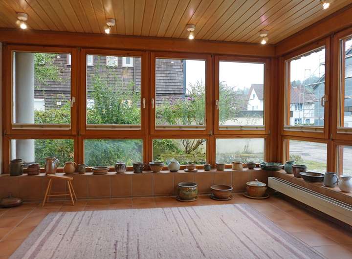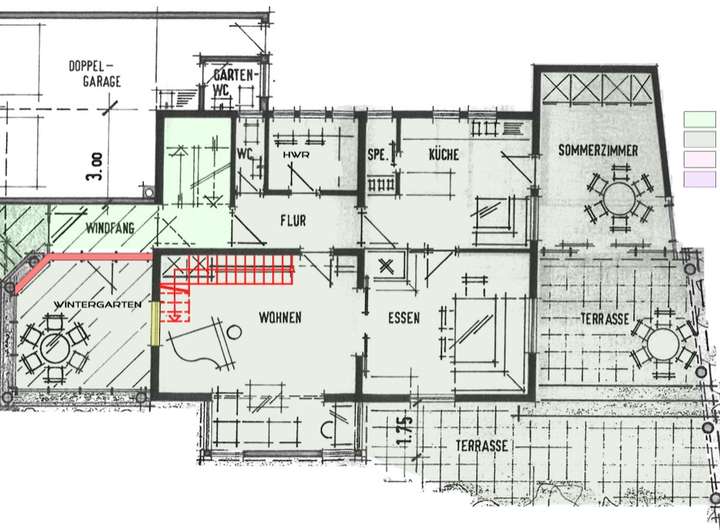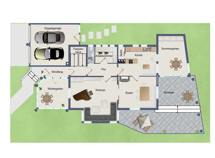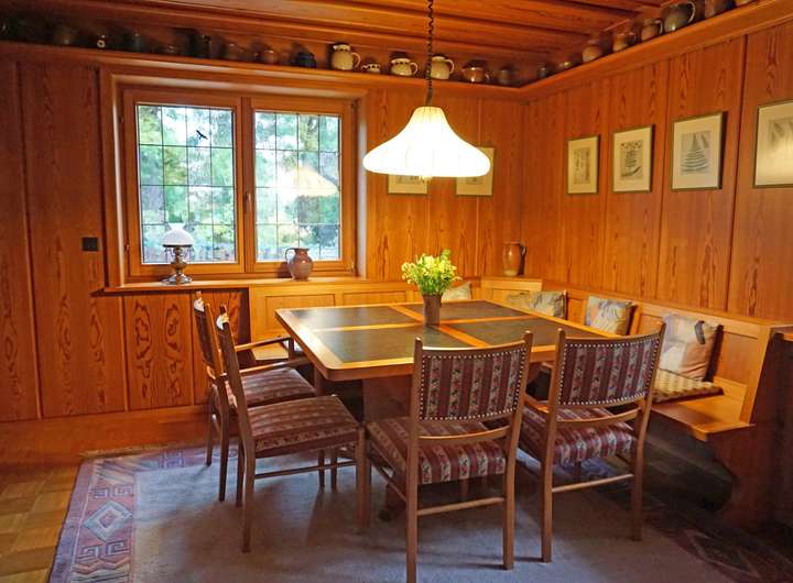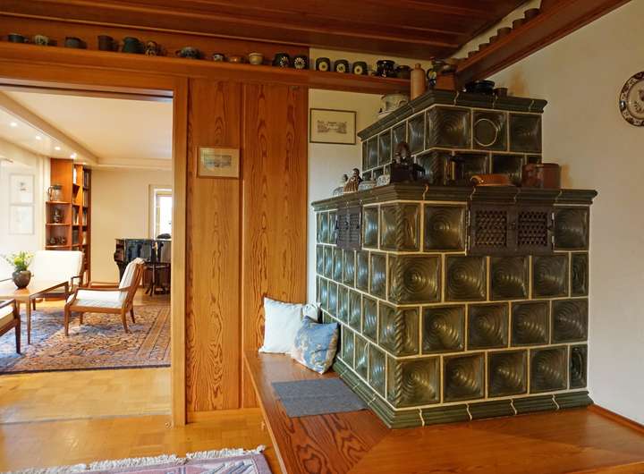 Das Erdgeschoss beeindruckt durch seine Großzügigkeit. Es umfasst ein großes Wohnzimmer mit Erker, ein Esszimmer mit edler Holzvertäfelung und Kachelofen sowie eine Küche mit direktem Zugang zur Terrasse. Zudem finden Sie hier einen Hauswirtschaftsraum und eine separate Toilette. Ein weiteres Zimmer im Eingangsbereich kann als Wintergarten oder Büro genutzt werden. Die Terrasse bietet einen überdachten Bereich, der als Sommerzimmer dient.