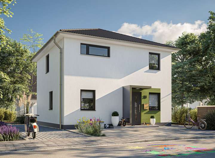 Die kubische Form ist der Klassiker im Stadthausdesign und prägt auch das Aussehen unseres Stadthaus Flair 124. Im Inneren setzt sich der urbane Stil fort: der großzügige Wohn- und Essbereich erstreckt sich über die gesamte Hausbreite und ist das Herzstück des Hauses. Große Fenster lassen viel Tageslicht hinein und führen gleich hinaus zu Ihrem Wohnzimmer im Grünen – der Terrasse