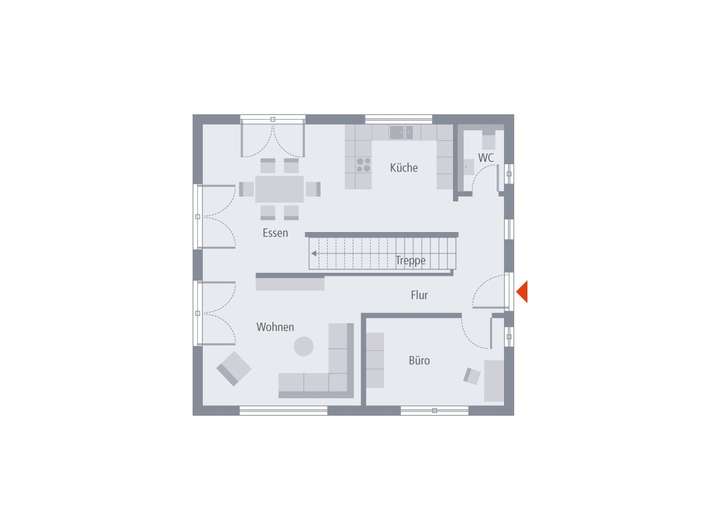 Gemütlich und zugleich großzügig präsentiert sich unterdessen das Erdgeschoss. Diele und Wohn-Ess-Küche verschmelzen zu einer Einheit und vermitteln ein Gefühl von Weite, das die großen Fensterfronten noch zusätzlich unterstreichen. Die in der Mitte der Etage platzierte Treppe fungiert als Raumteiler und zugleich optisches Highlight. Ebenfalls Parterre befinden sich ein Büro/Gästezimmer sowie ein Gäste-WC.
