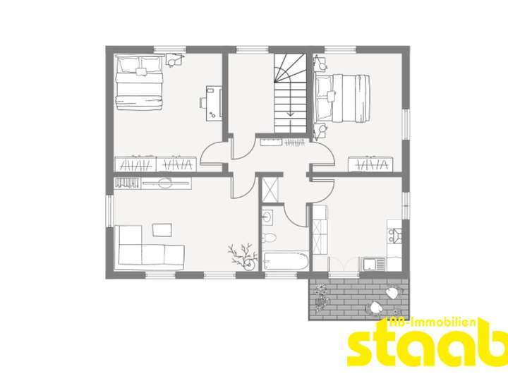 1. Obergeschoss: Treppenaufgang - Eingangsbereich/ Flur Wohn-/Esszimmer Schlafzimmer Kinder-/Arbeitszimmer Wohnküche mit Zugang auf den Balkon und Blick in den Garten- Tageslichtbad mit Wanne