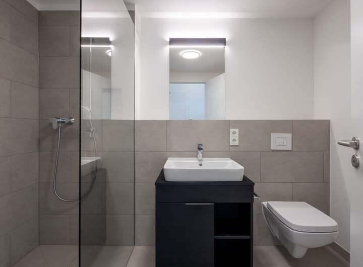 • Allgemeine Flächen: Wand- und Bodenfliesen in grauem Steineffekt