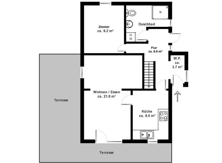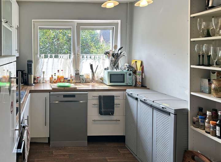 Eine moderne und geschmackvolle Einbauküche mit allen erforderlichen Geräten und viel Stauraum bietet Entfaltungsmöglichkeiten für Kochliebhaber. Das Duschbad ist mit großformatigen Fliesen und einem Handtuchheizkörper ausgestattet und bietet Platz für Ihre Waschmaschine.