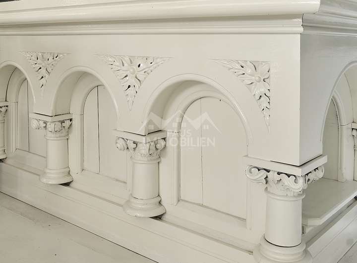 - **Historische und moderne Details:** Ein prächtiger Kronleuchter, ein gemütlicher Pellet-Ofen, hochwertige Stuckelemente und ein historischer Altar, der als stilvoller Schreibtisch dient, verleihen der Immobilie ihren unverwechselbaren Charakter.