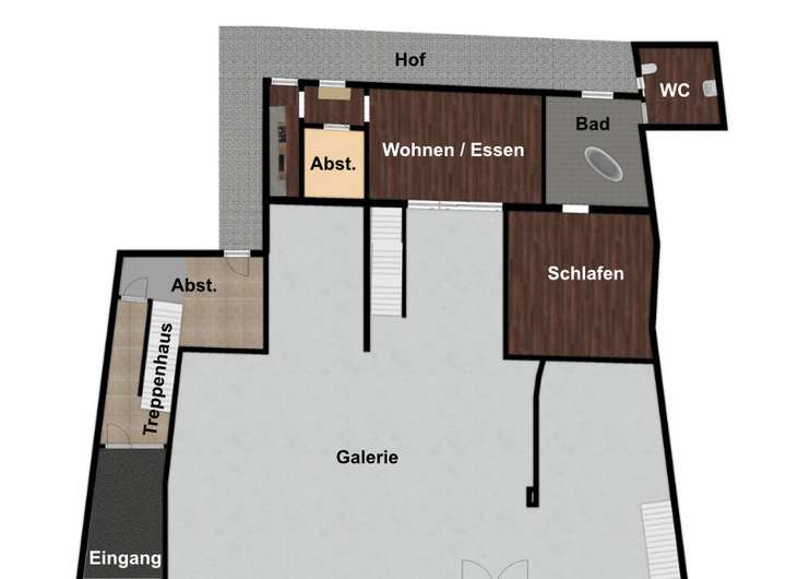 Dieses Anwesen besticht durch seine einzigartige Kombination aus historischem Fachwerk und dem architektonischen Stil der 1950er Jahre. Es verfügt über einen funktionsfähigen Lastenaufzug, der die Galerie mit dem Keller verbindet – ein charmantes Relikt aus vergangenen Zeiten und ein Zeugnis seiner Vergangenheit als Sparkasse der Stadt Linz.