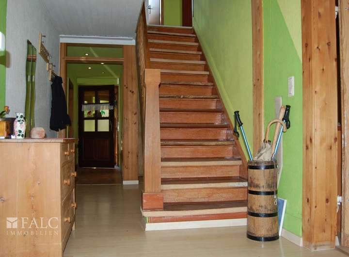Die Böden sind mit Dielen, Fliesen und Laminat ausgelegt, und eine Holztreppe verbindet die Etagen.