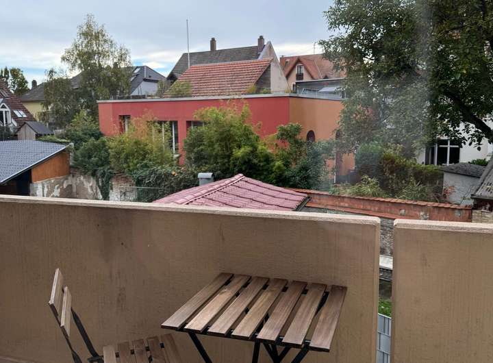 - heller Wohnbereich inkl. angrenzendem Balkon. Zur Balkonausstattung gehören zwei Stühle und ein Tisch.