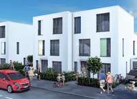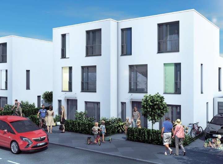 Konzipiert ist die Bebauung u-förmig mit insgesamt 3 Hausreihen um Gemeinschaftsflächen herum. Im hinteren