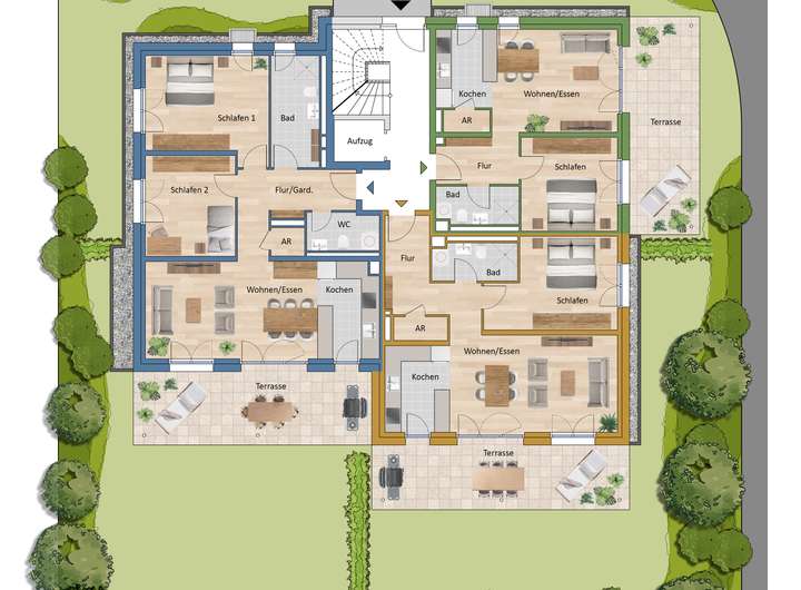 Die drei Gebäude unseren neuen Projekts TRIO VERDE Edingen sind entsprechend ihrer Größe als Zweispänner bzw. Dreispänner mit Dachterrassen-Wohnungen geplant. Die Eingänge liegen jeweils an einem Quartiersweg.
