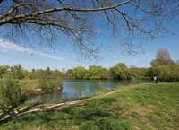 Grünflächen des Pestalozzi-Sportgeländes, umgeben von Feldern und altem