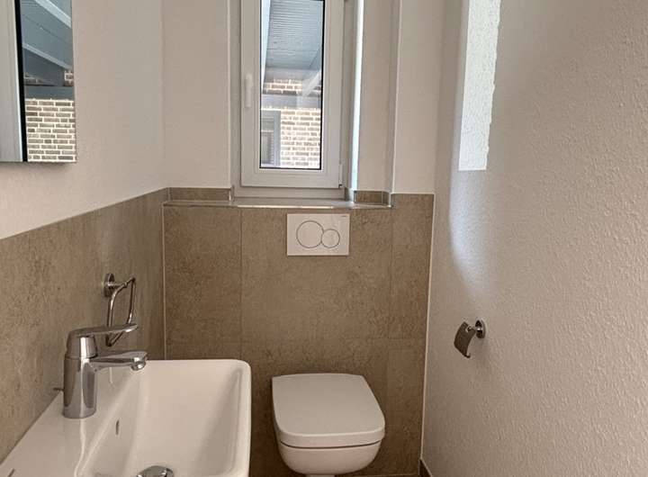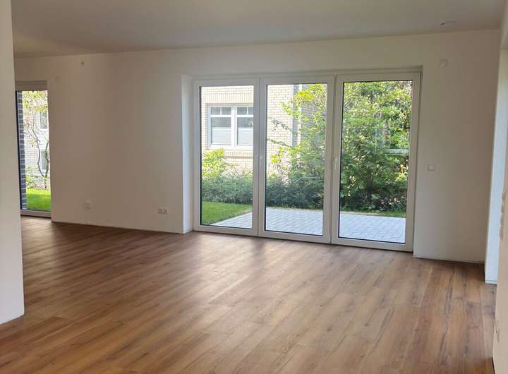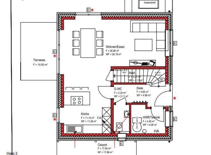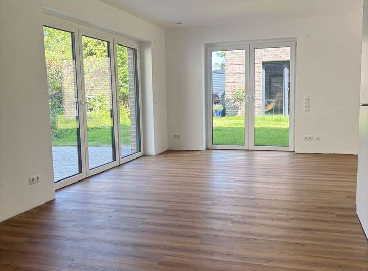 Im Eingangsbereich erwarten Sie ein praktisches Gäste-WC sowie ein Hauswirtschaftsraum. Gehen Sie weiter, gelangen Sie in den offenen Wohn- und Essbereich, der durch große bodentiefe Fenster besticht und eine angenehme Atmosphäre schafft.