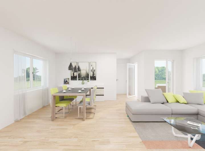 Die Küche ist mit einer hochwertigen Einbauküche (zuzüglich 10.250 €) ausgestattet, die das Herz jedes Hobbykochs höher schlagen lässt. Für weiteren Komfort sorgen die Luft/Wasser-Wärmepumpe, Fußbodenheizung und dreifachverglaste Kunststofffenster mit elektrischen Rollläden.