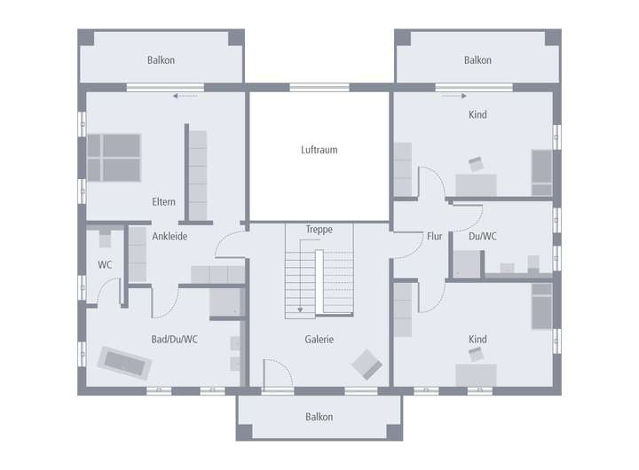 Über die zentral im Dielenbereich gelegene Treppe führt der Weg ins Obergeschoss, das in Eltern- und Kinderbereich unterteilt ist. Das Reich der Eltern besteht aus einem großen Schlafzimmer mit Ankleideraum und sich direkt anschließendem Bad mit abgetrenntem Toilettenbereich. Gegenüber: der Rückzugsort für die Kinder. Zwei Zimmer sowie ein von beiden Seiten zugängliches Bad stehen hier zur Verfügung. Zudem garantieren drei Balkone Sonnengenuss zu jeder Tageszeit.