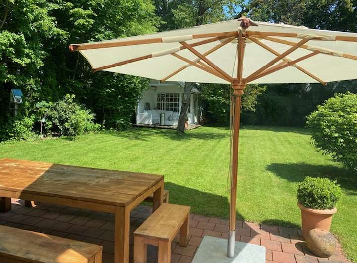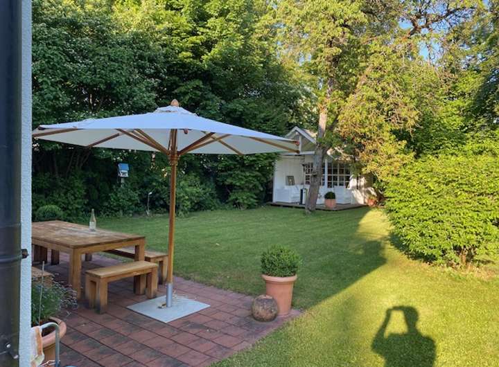 Im Garten liegt ein schönes Gartenhaus mit Terrasse und Loungemöbeln. Das Haus verfügt über eine Doppelgarage, Doppelparkplatz und Wallbox für e-Autos.