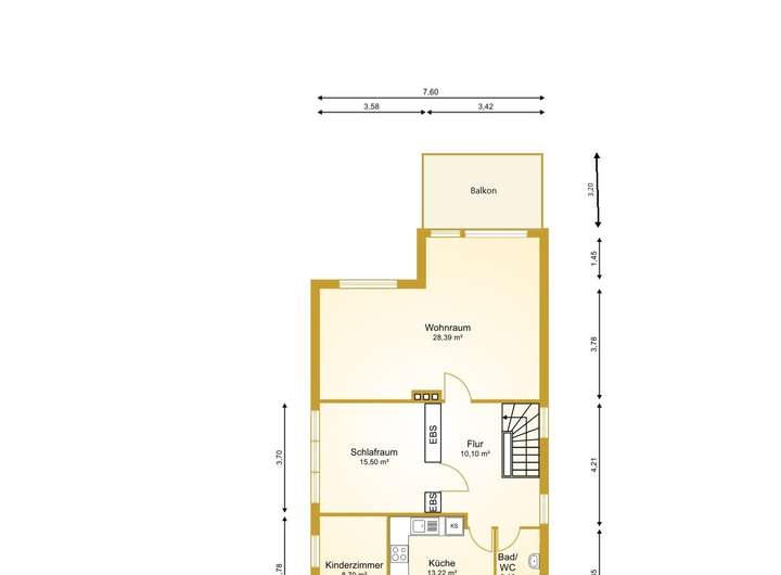 Vom Flur im EG gelangt man in die Obergeschosswohnung. Die Wohnung hat eine Größe von ca. 83 m² und ist langfristig gut vermietet. Zudem befindet sich die Wohnung in einem sehr gepflegten Zustand. Sie besteht aus 3 Zimmern, einer Küche, eine Badezimmer und einem Balkon. Diese vermietete Wohnung trägt ein Großteil der Kreditkosten.
