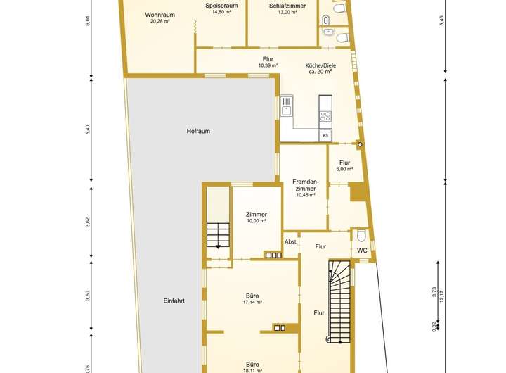 Die Wohnfläche der gesamten Erdgeschosswohnung beträgt ca. 168 m² mit 7 Zimmern, zwei Badezimmer und einer offenen Küche.