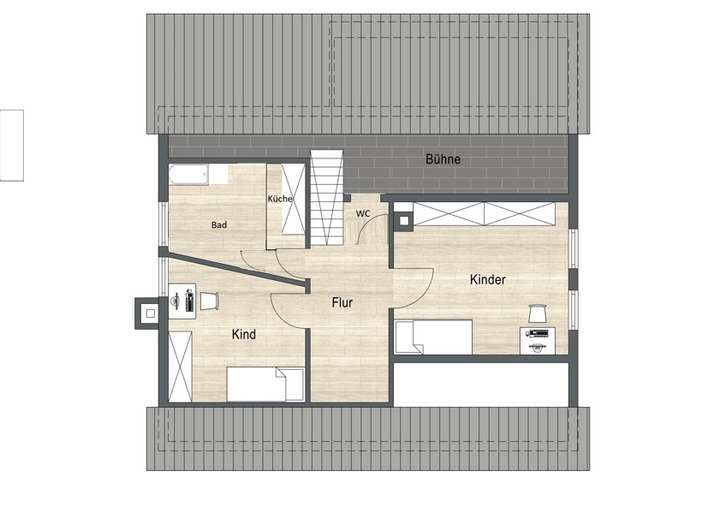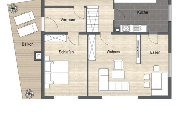 Die Hauptwohnung befindet sich im Obergeschoss des Hauses und ist wie folgt ausgestattet: großzügige Diele, Wohn-/Esszimmer, Küche, Schlafzimmer, Badezimmer, Vorraum, teilweise überdachter Balkon. Das Dachgeschoss bietet Ihnen zwei weitere zusätzlich schöne Wohnräume sowie ein Badezimmer und ein sep. WC.