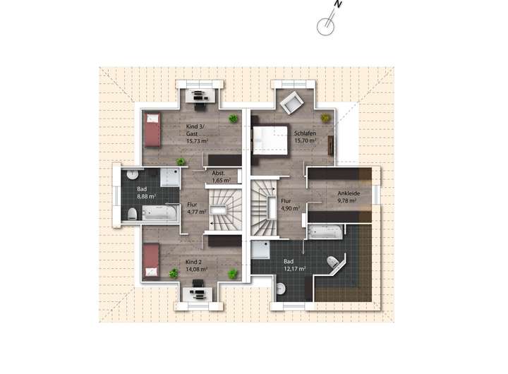 Küche, zwei oder drei Schlafzimmer im Obergeschoss sowie bis zu 2 Schlafzimmer im Dachgeschoss