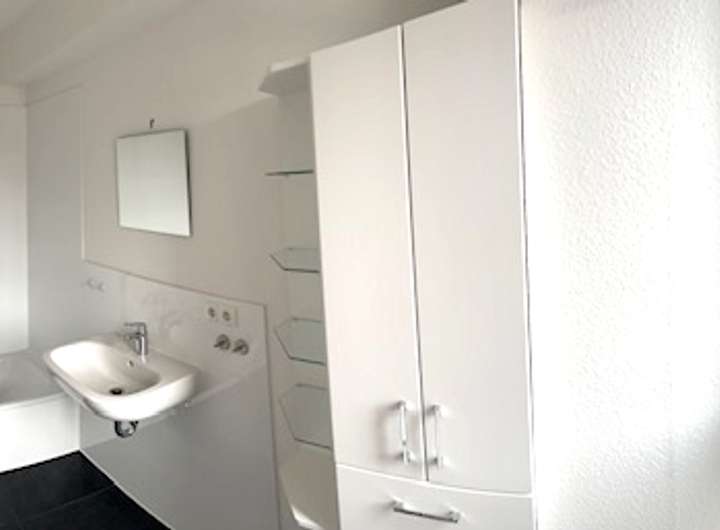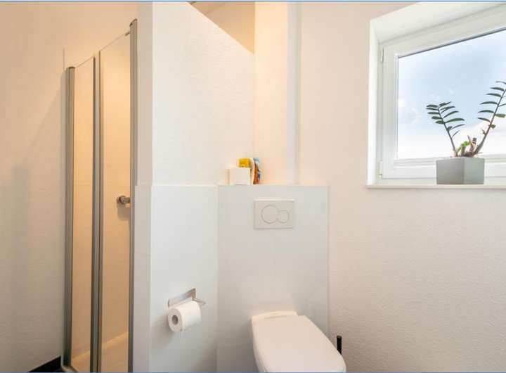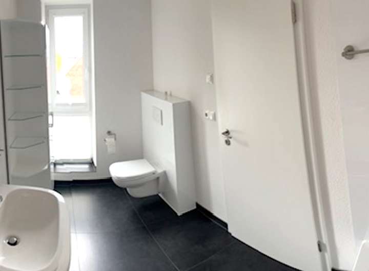 •Modernes Tageslichtbad mit Badewanne und Fußbodenheizung im Obergeschoss, separates Duschbad mit Echtglasduschabtrennung, Fußbodenheizung im Staffelgeschoss/Dachstudio, Gäste-WC mit Fenster im Erdgeschoss