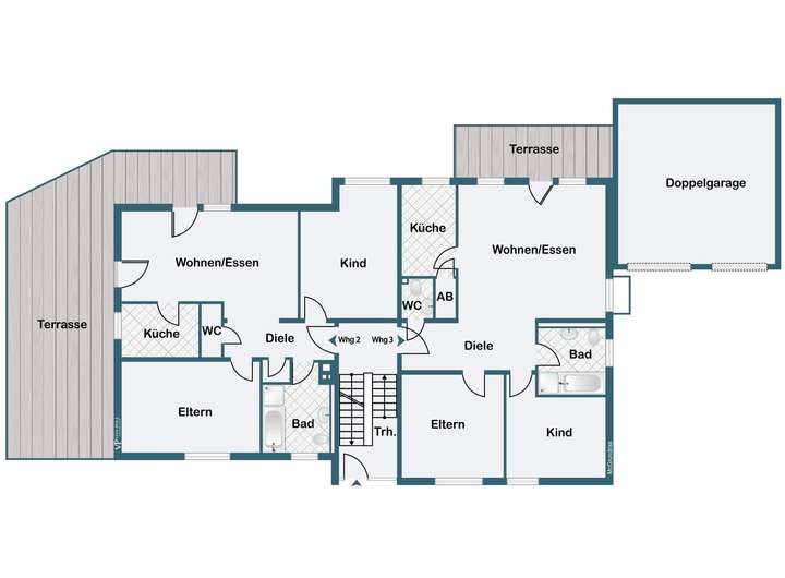 Wohnung 3 (EG 2 (hinten)): ca. 108,43 m², 3 Zimmer, Küche, Bad, Abstellraum, große Terrasse und Gartennutzung