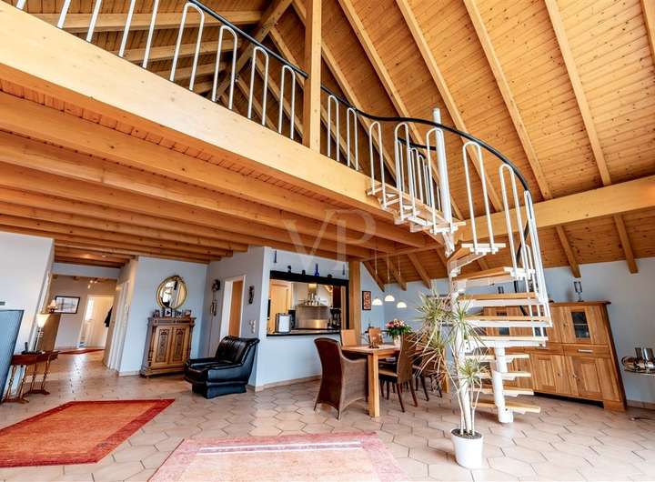Im obersten Geschoss befindet sich eine weitere exklusive und hochwertig ausgestattete Penthouse Wohnung. Auf zwei Etagen verteilen sich ca. 200 m² auf 5 Zimmer, Galerie, Küche, 2 Bäder und ein Abstellraum. Der großzügige Balkon bietet nicht nur eine optimale Südausrichtung sondern auch einen traumhaften Fernblick bis zum Schloss Montabaur. Raumhohe Fensterfronten mit Beschattungsanlage, eine großzügige Deckenhöhe mit offener Holzbalkendecke aus naturbelassenem Kiefernholz, Fußbodenheizung und eine Galerie sind nur einige der Extras, die diese anspruchsvolle Wohnung abrunden.
