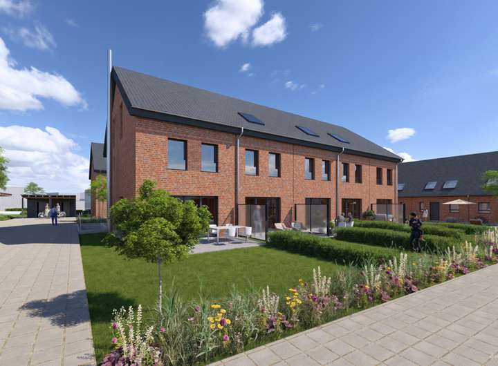 Jedes Haus besitzt eine eigene Terrasse. Ein Carport mit Vorbereitung für E-Mobilität - teils mit integriertem Abstellraum für Gartengeräte und Fahrräder - muss separat erworben werden. Für eine effiziente Wärmeversorgung sorgt eine zentrale Energieversorgungsanlage auf Basis erneuerbarer Rohstoffe, zzgl. einer PV-Anlage mit Batteriespeicher pro Haus, wodurch die Eigentümer eine Stromersparnis von ca. 40–50 % erzielen können.