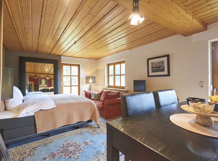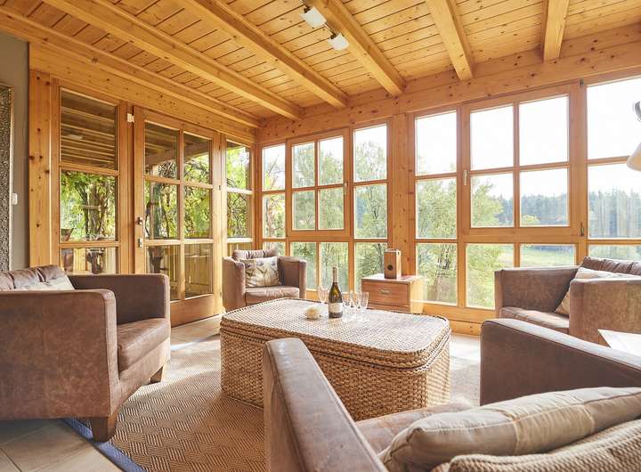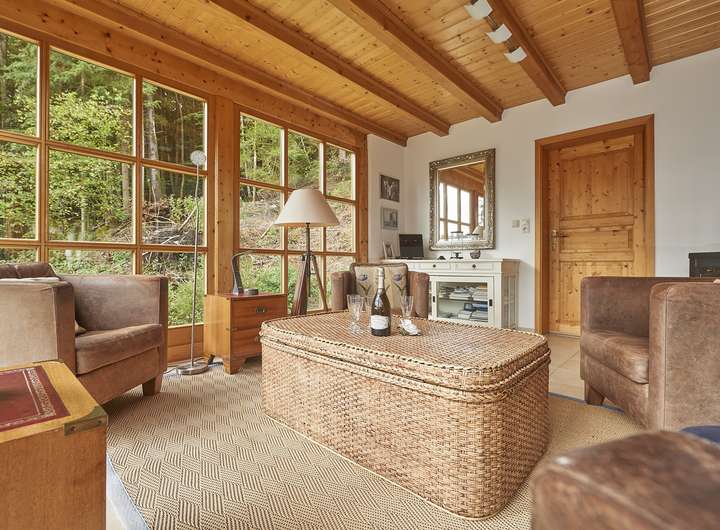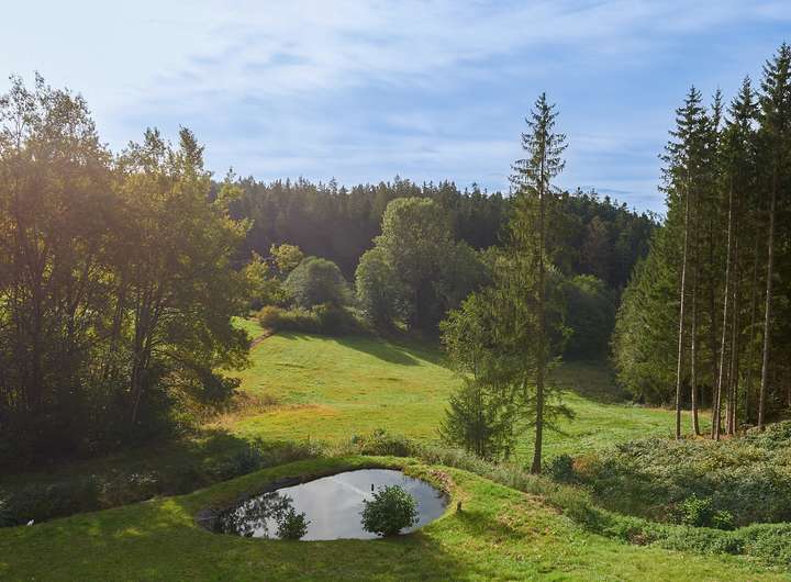 Zu den besonderen Highlights dieser Immobilie zählen ein idyllischer Fischteich und ein natürlicher Bachlauf, die das Grundstück aufwerten und eine harmonische Atmosphäre schaffen. Über der Doppelgarage befindet sich eine separate 2-Zimmer-Ferienwohnung, die ideal für Gäste oder zur Vermietung genutzt werden kann. Eine großzügige Sonnenterrasse und ein gepflegter Wintergarten laden zum Entspannen und Verweilen ein.