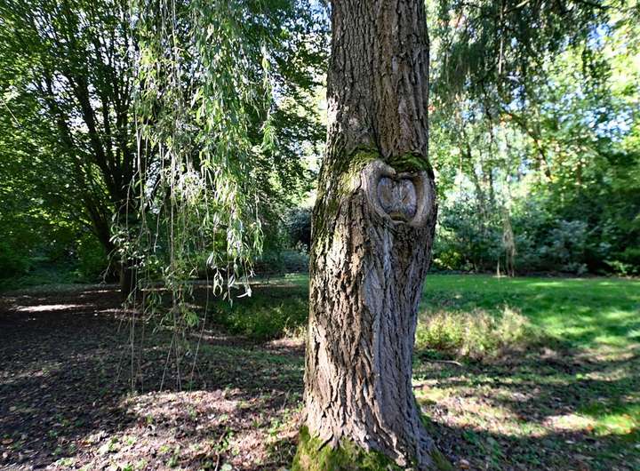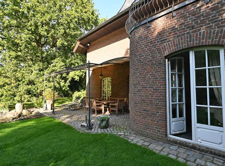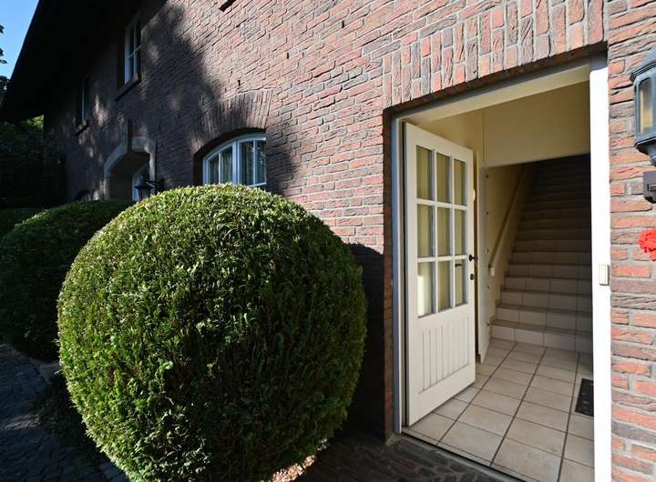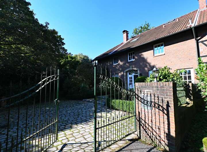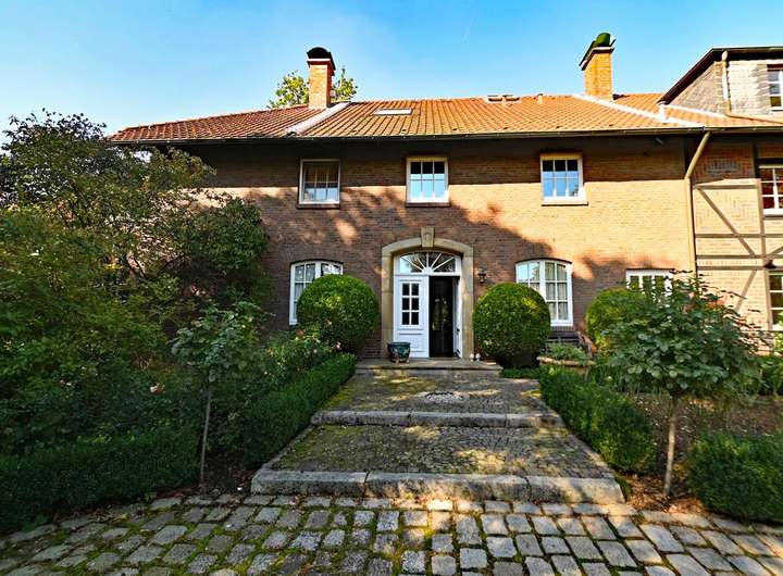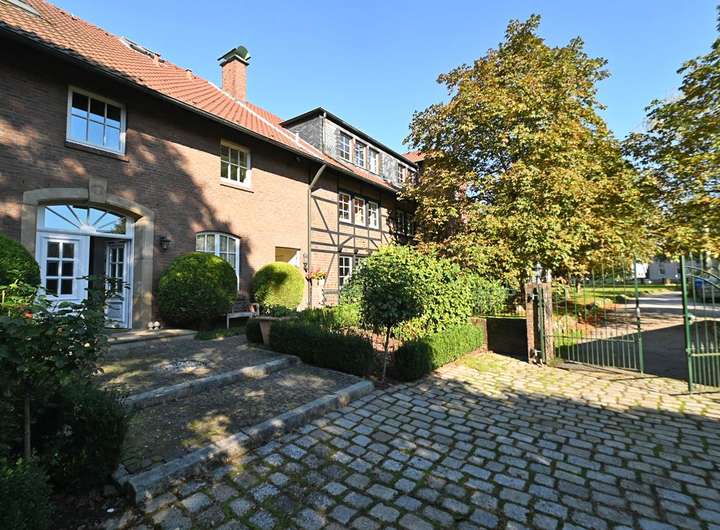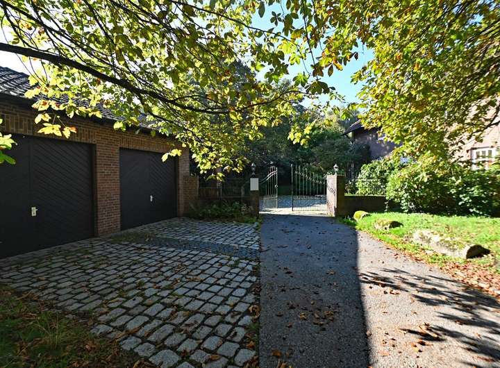 Von außen: Zufahrt mit schmiedeeiserner, doppelflügeliger Toranlage zum Grundstück, großzügige Stellplatzflächen mit Natursteinpflaster, Garagenhaus für zwei PKW mit Gartengeräte-Raum, wunderschöner Parkgarten mit wertvollem Baumbestand, Rasenflächen und hochwertige Fassadengestaltung in Klinker, akzentuiert mit Ruhrsandstein. Gebogene, gesprosste Fenster, Haustür.