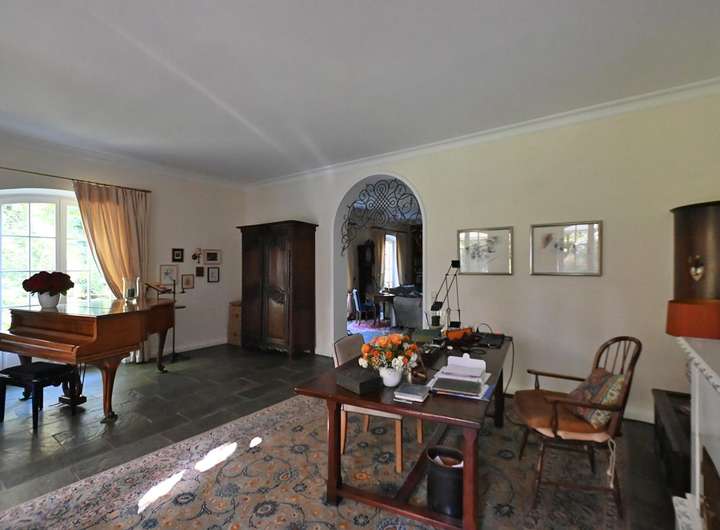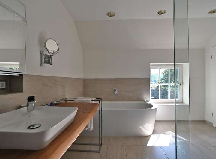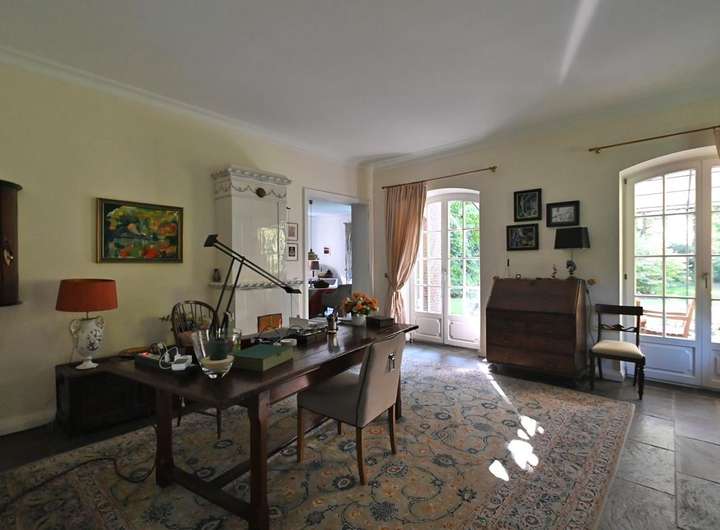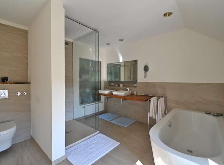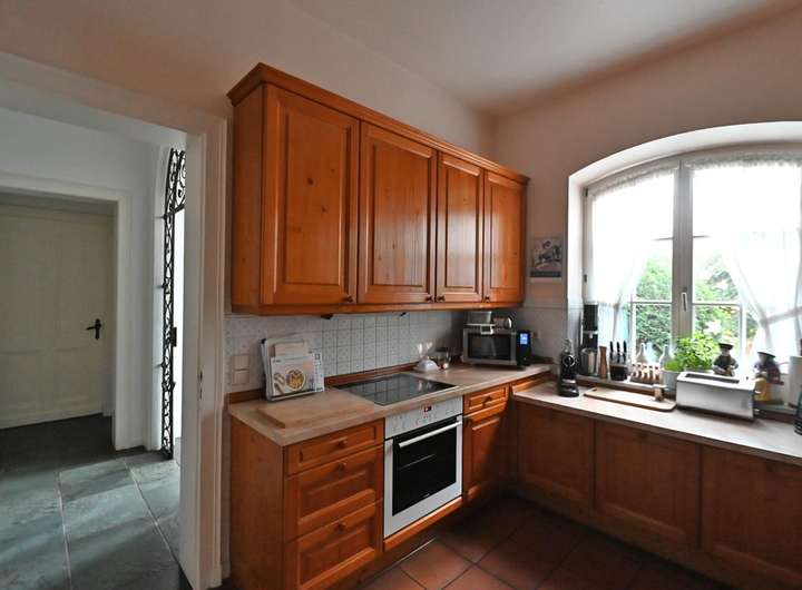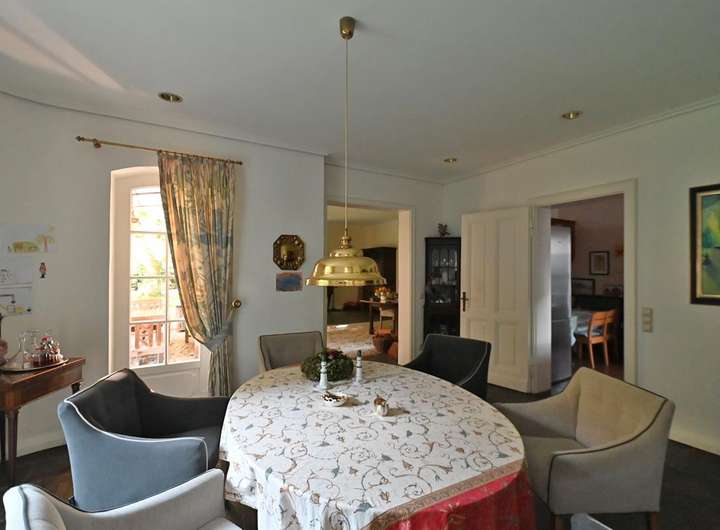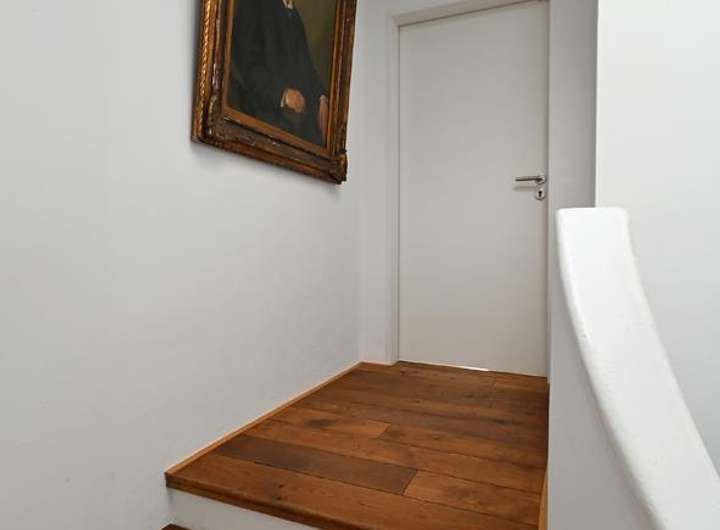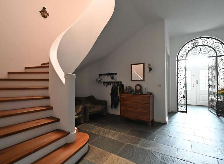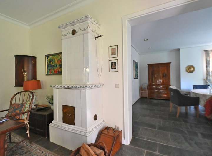 Von innen: Tolles Entrée mit ganz viel Platz und wunderschöner, breiter, geschwungener Wendeltreppe aus Stahlbeton mit Lichtkuppel, weiß geputzten Wangen und Massivholzdielen. Echter Natursteinboden (dunkelgrüner Schiefer) in der gesamten unteren Ebene, in der oberen Ebene Massivholz-Dielenböden. Ein offener Kamin und ein antiker schwedischer Kachelofen im Wohnbereich. Essplatz in einem herrlichen Erkerelement, weiß gesprosste, bodentiefe, doppelflügelige Fensterelemente als Zugang zur Terrasse und in den Garten, dazu passende, weiße Massivholz-Landhaustüren mit massiven Messingbeschlägen, hohe Räume. Ein ganz neues, sehr hochwertiges Bad in neuestem Design im Obergeschoss der Hauptwohnung, ein Gäste-WC in gleichem Look, ein weiteres Bad im Dachgeschoss sowie ein Duschbad in der Einliegerwohnung. Die Ausstattung im Einliegerteil in ordentlicher, aber deutlich einfacherer Ausführung.