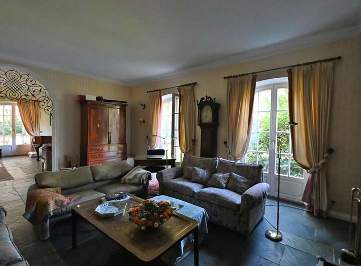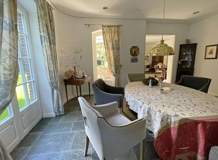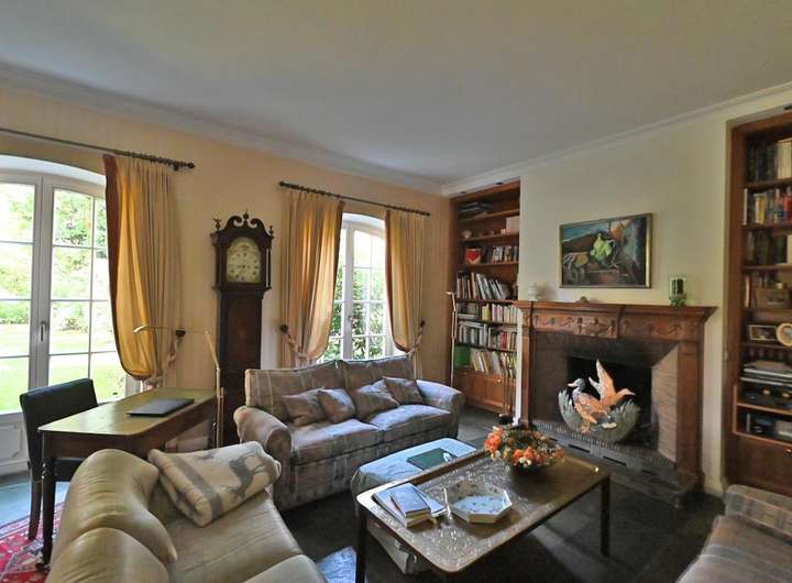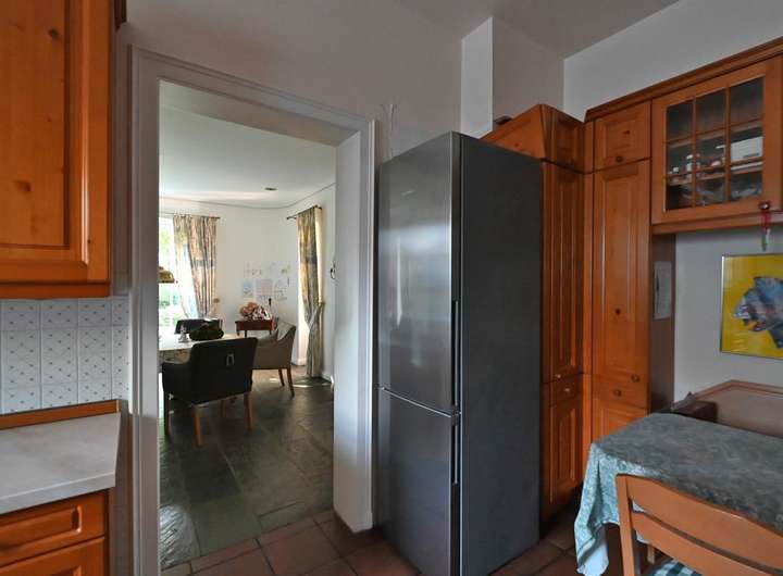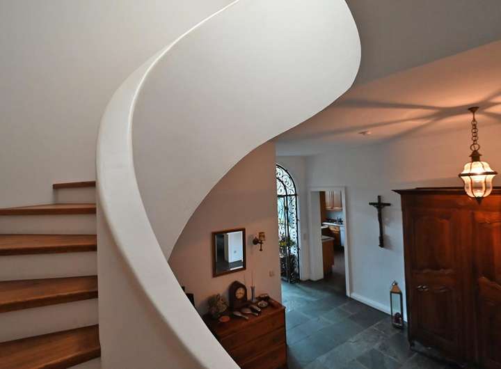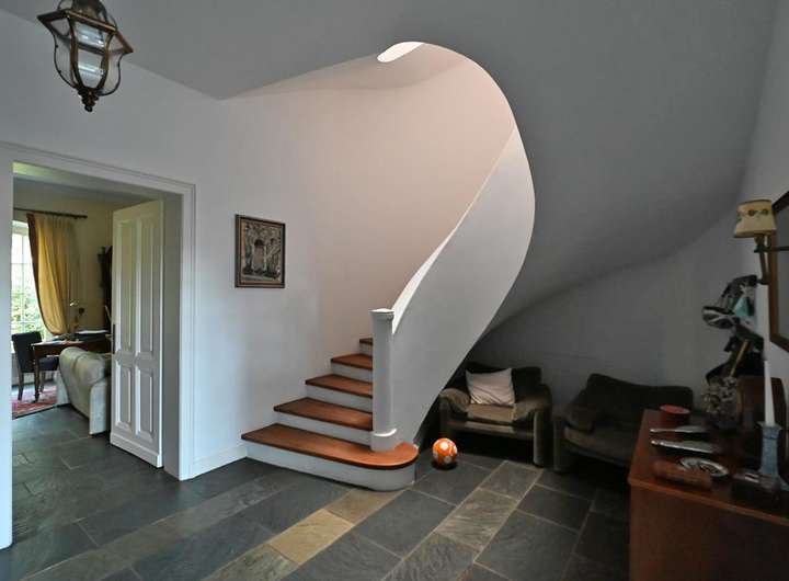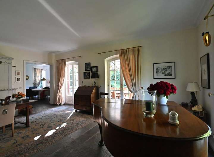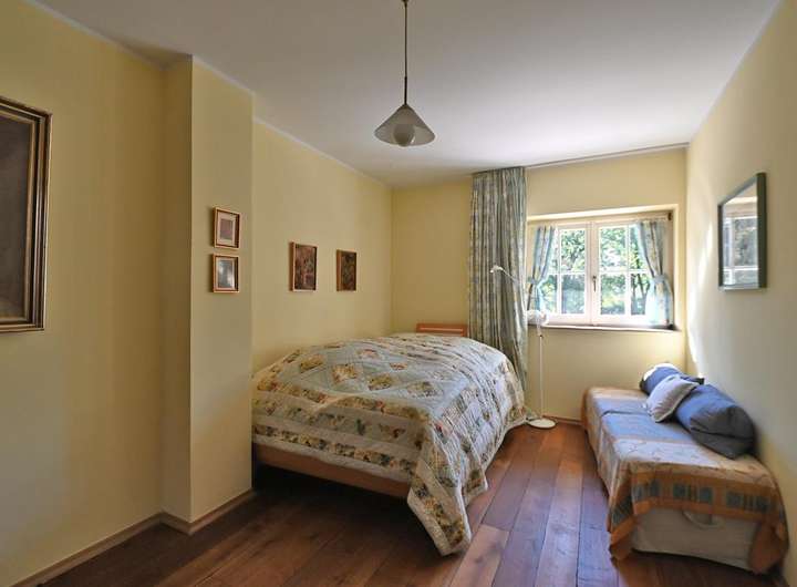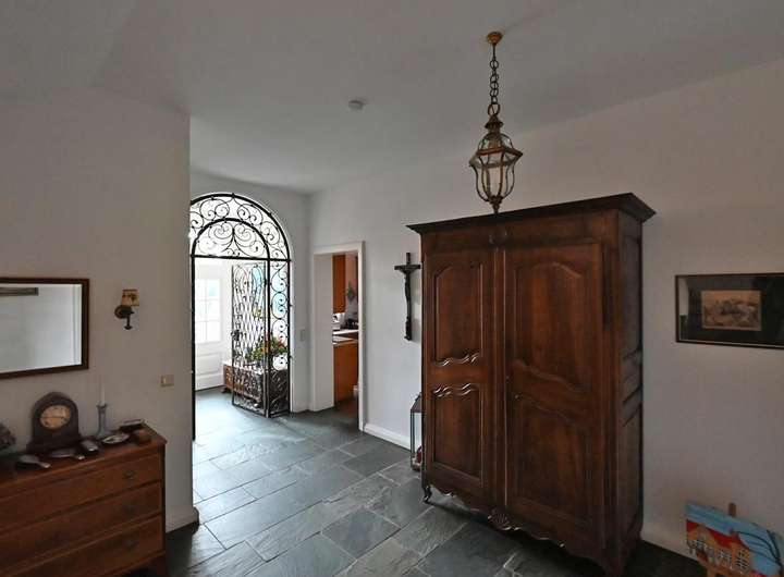 Von innen: Tolles Entrée mit ganz viel Platz und wunderschöner, breiter, geschwungener Wendeltreppe aus Stahlbeton mit Lichtkuppel, weiß geputzten Wangen und Massivholzdielen. Echter Natursteinboden (dunkelgrüner Schiefer) in der gesamten unteren Ebene, in der oberen Ebene Massivholz-Dielenböden. Ein offener Kamin und ein antiker schwedischer Kachelofen im Wohnbereich. Essplatz in einem herrlichen Erkerelement, weiß gesprosste, bodentiefe, doppelflügelige Fensterelemente als Zugang zur Terrasse und in den Garten, dazu passende, weiße Massivholz-Landhaustüren mit massiven Messingbeschlägen, hohe Räume. Ein ganz neues, sehr hochwertiges Bad in neuestem Design im Obergeschoss der Hauptwohnung, ein Gäste-WC in gleichem Look, ein weiteres Bad im Dachgeschoss sowie ein Duschbad in der Einliegerwohnung. Die Ausstattung im Einliegerteil in ordentlicher, aber deutlich einfacherer Ausführung.